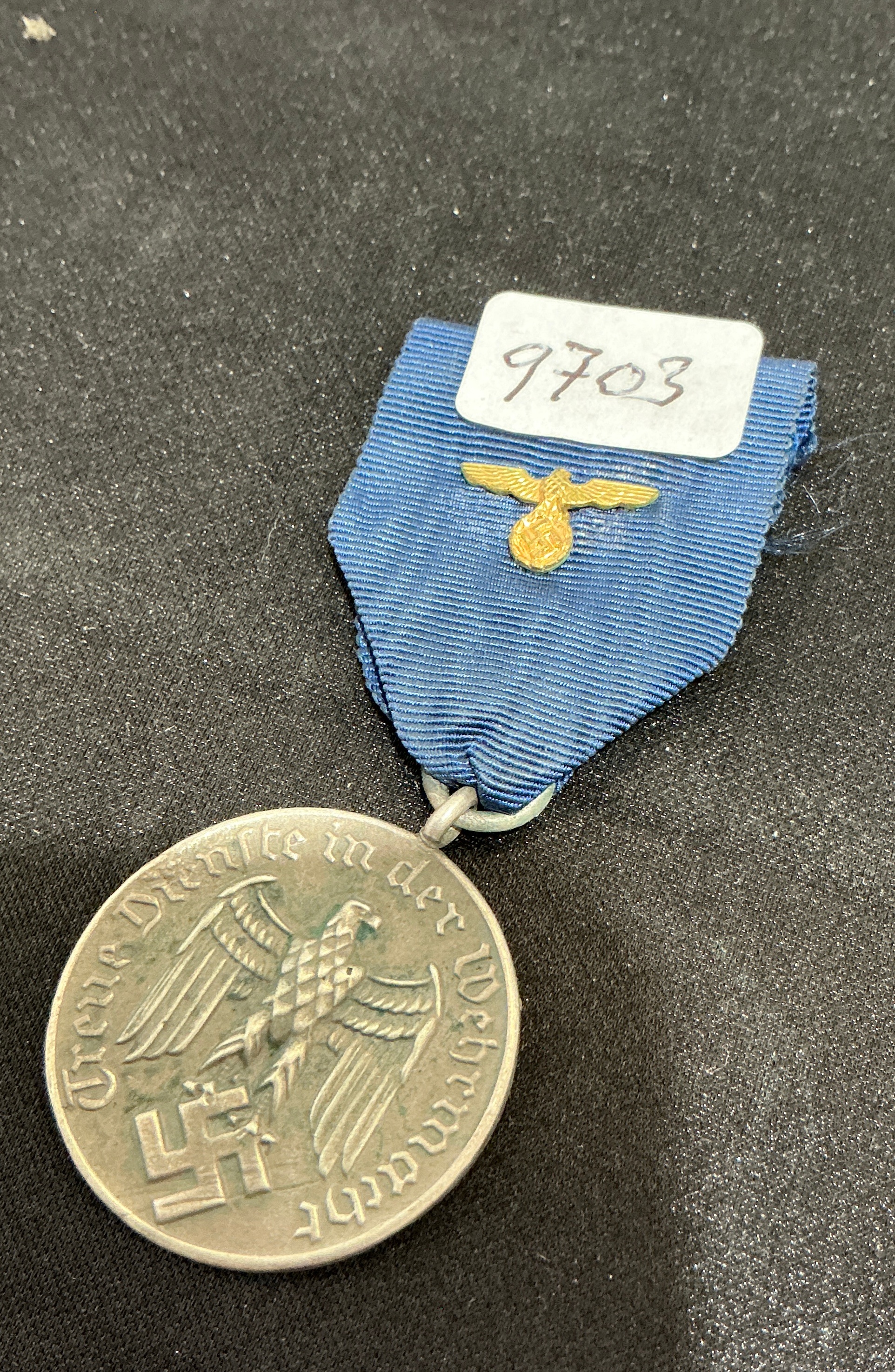 A German Third Reich period Wehrmacht 4-Year Long Service Award (Wehrmacht-Dienstauszeichnung, 4. Klasse). The medal is circular and struck in a silver-toned metal alloy. The obverse features the national emblem of an eagle clutching a swastika, surrounded by the gothic script inscription Treue Dienste in der Wehrmacht. The reverse bears a central numeral 4 within an oak leaf wreath, signifying four years of military service. The medal is suspended from its original cornflower-blue ribbed ribbon. Pinned to the ribbon is a small silvered metal device depicting the Army (Heer) and Navy (Kriegsmarine) style eagle with down-swept wings. The item is accompanied by a small white inventory tag numbered 9703.