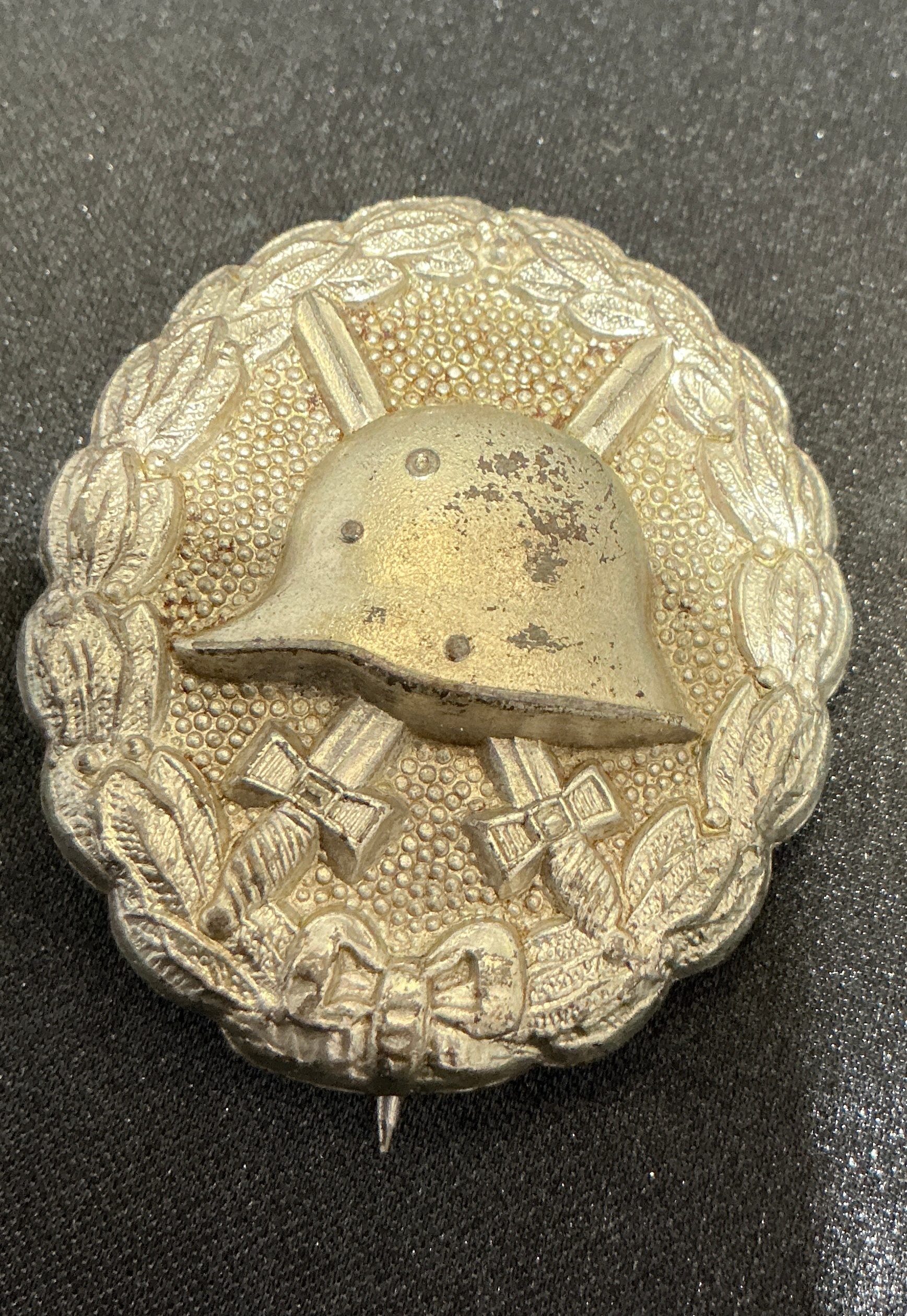 This is an Imperial German 1918 pattern Wound Badge in Gold grade. The badge is of die-stamped, hollow-back construction. The obverse features a central World War I M16 pattern steel helmet with characteristic lug vents, superimposed over a pair of crossed swords. The background is finely pebbled, all contained within an oval laurel leaf wreath that is tied with a bow at the bottom. The reverse displays the hollow-back stamping and is fitted with a functional vertical needle pin, a block hinge, and a simple wire ‘C’ catch.