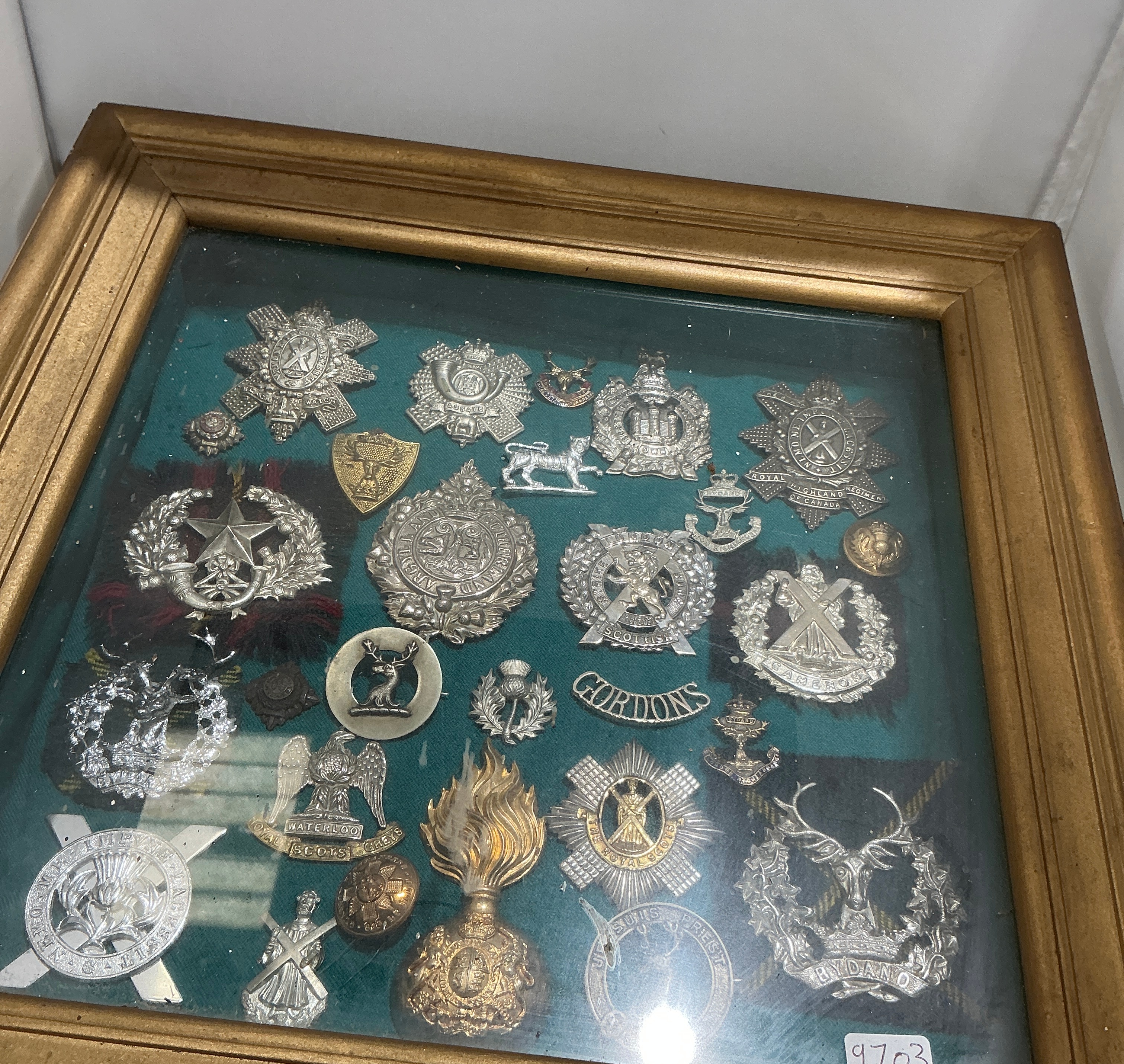 A collection of predominantly British Army Scottish Regiment cap badges, insignia, and accessories, professionally mounted on a green baize ground within a glazed gilt-moulded frame. The assortment includes white metal and brass badges for various regiments such as The Black Watch (Royal Highland Regiment) featuring the Star of the Order of the Thistle and the motto Nemo Me Impune Lacessit; the Gordon Highlanders glengarry badge with a stag head and Bydand motto; and the Argyll and Sutherland Highlanders central glengarry badge. Other notable insignia include the Waterloo Eagle of the Royal Scots Greys (2nd Dragoons), the circular badge of the Highland Light Infantry, the Queen’s Own Cameron Highlanders badge with St. Andrew Cross, and the Royal Scots (Lothian Regiment) badge. The collection also features insignia for the King’s Own Scottish Borderers, the Cameronians (Scottish Rifles), and the Seaforth Highlanders. Also present are a Royal Scots Fusiliers exploding grenade cap badge, a fusilier grenade badge with an attached yellow hackle, a Gordons brass shoulder title, and various brass buttons and smaller collar badges.