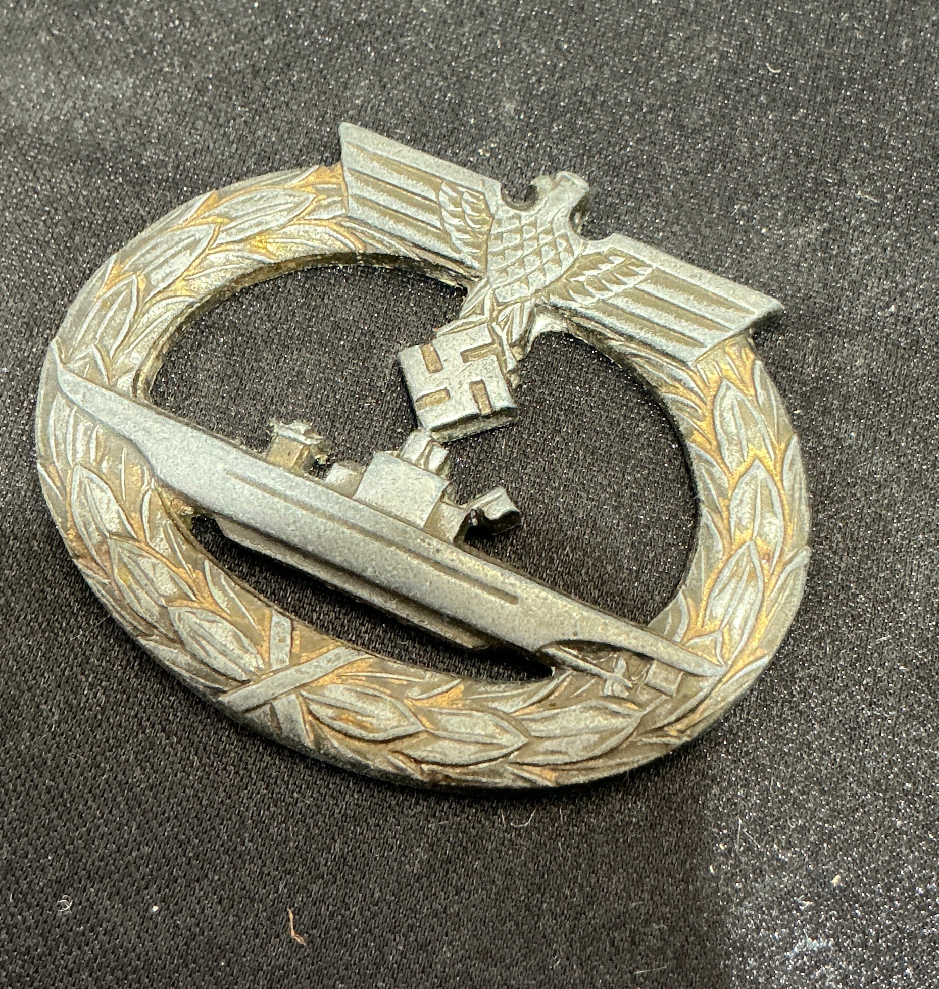 A WWII-period German Kriegsmarine U-boat War Badge (U-Boots-Kriegsabzeichen). This example is of one-piece, die-cast construction, manufactured in a zinc alloy. The obverse features an oval laurel wreath surrounding a profile view of a submarine, surmounted by a Kriegsmarine-style eagle with outstretched wings clutching a swastika. Traces of the original gold-coloured wash remain in the recessed areas of the wreath. The reverse bears the raised maker’s mark R.S., identifying the manufacturer as Rudolf Souval of Vienna. The reverse shows significant tool marks and evidence of where the original vertical pin, hinge, and catch assembly were previously attached.