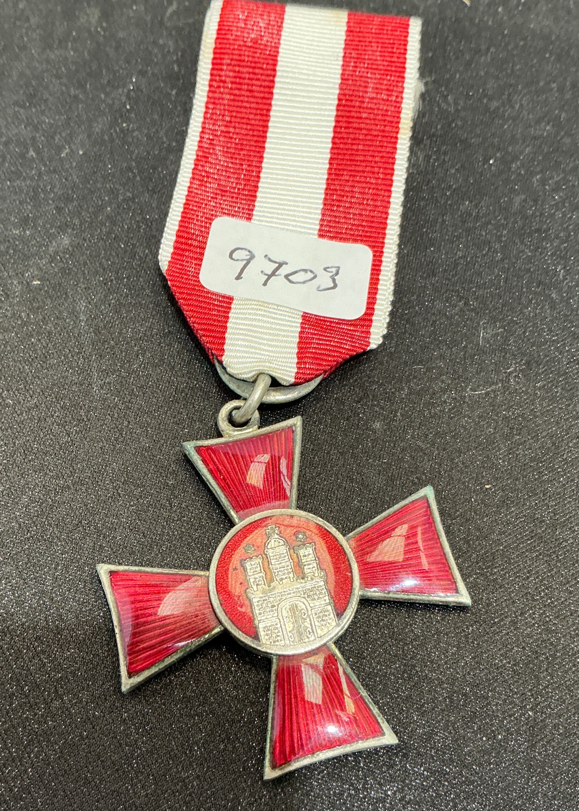 An Imperial German World War I Hanseatic Cross (Hanseatenkreuz) for the city of Hamburg. The decoration is a silvered metal cross pattée featuring translucent red enamel over an engine-turned ground on the obverse arms. The obverse central circular medallion displays the silvered coat of arms of Hamburg, depicting a castle with three towers. The reverse of the cross is plain silvered metal with a central circular medallion bearing the German inscription Für Verdienst im Kriege 1914. The award is suspended from its original white silk ribbon which features two broad red stripes at the edges.