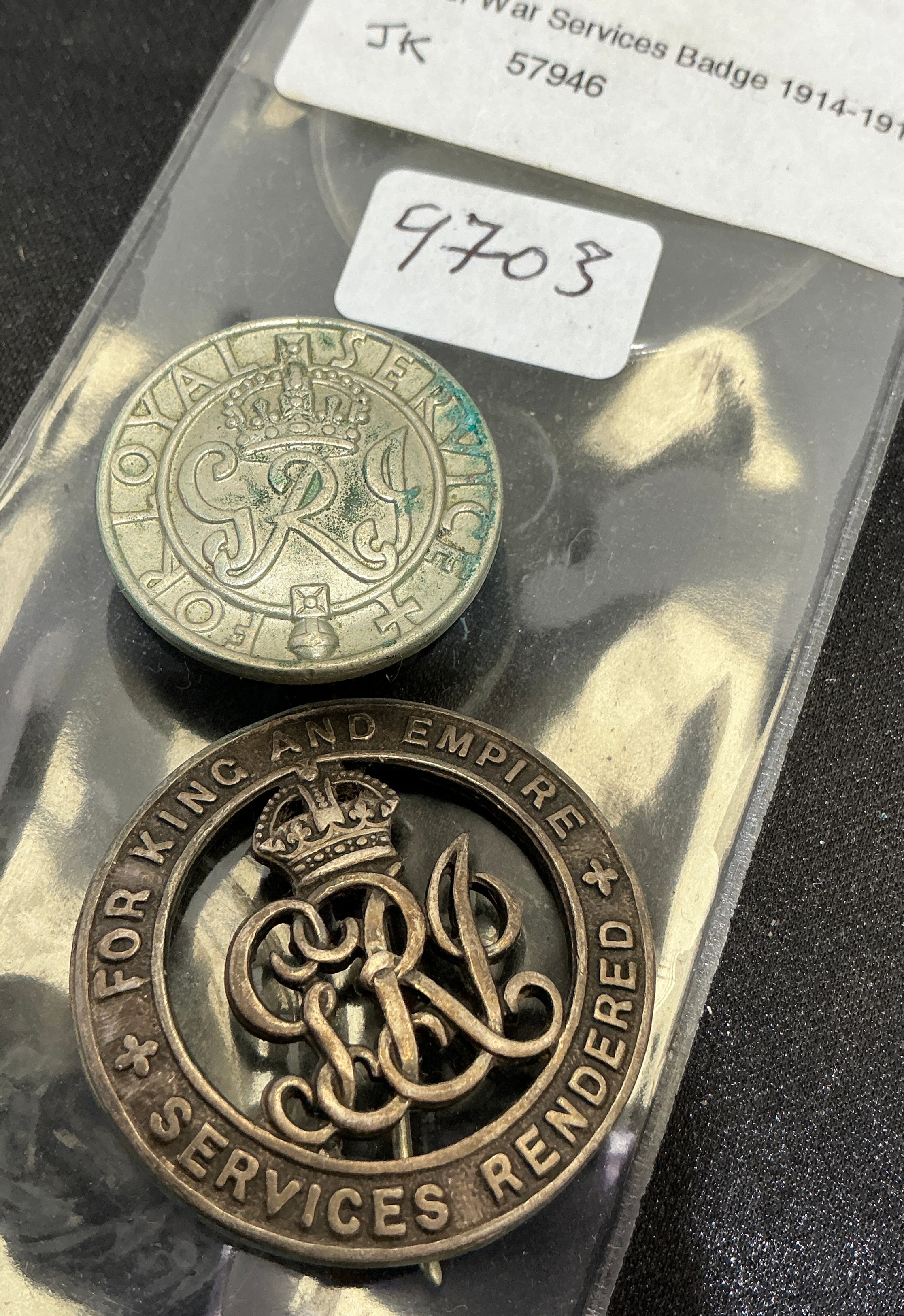 This lot consists of two British military discharge badges. The first is a First World War Silver War Badge, also known as the Services Rendered Badge. It is a circular sterling silver open-work badge featuring the royal cipher GRI surmounted by a Tudor crown, within a border inscribed FOR KING AND EMPIRE + SERVICES RENDERED. The reverse is stamped with the unique issue serial number B300890 and retains its original horizontal pin and C-clasp fitting. The second item is a Second World War King’s Badge for Loyal Service. This circular white metal lapel badge depicts the royal cipher of King George VI beneath a crown, surrounded by the legend FOR LOYAL SERVICE. The reverse is fitted with two attachment lugs.