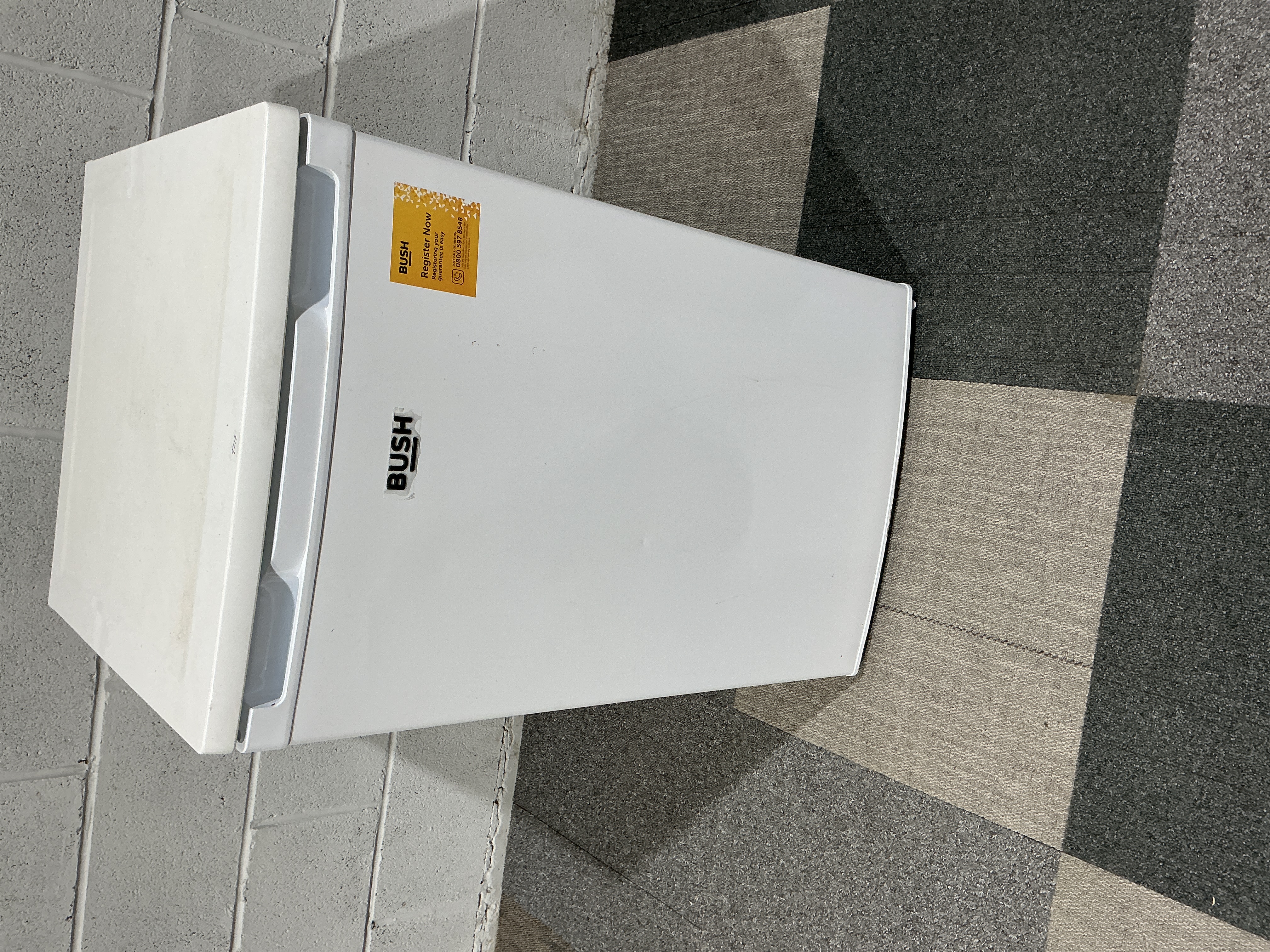This under-counter refrigerator by Bush is finished in white and includes an internal freezer compartment at the top. The interior layout consists of one glass shelf and a clear plastic vegetable drawer. The door is equipped with three clear plastic storage balconies for additional organisation. The unit features a yellow registration sticker on the front door with the text Register Now and a separate Bush brand decal. No model or serial numbers are visible in the provided images. Specifications for capacity and energy rating are not confirmed.