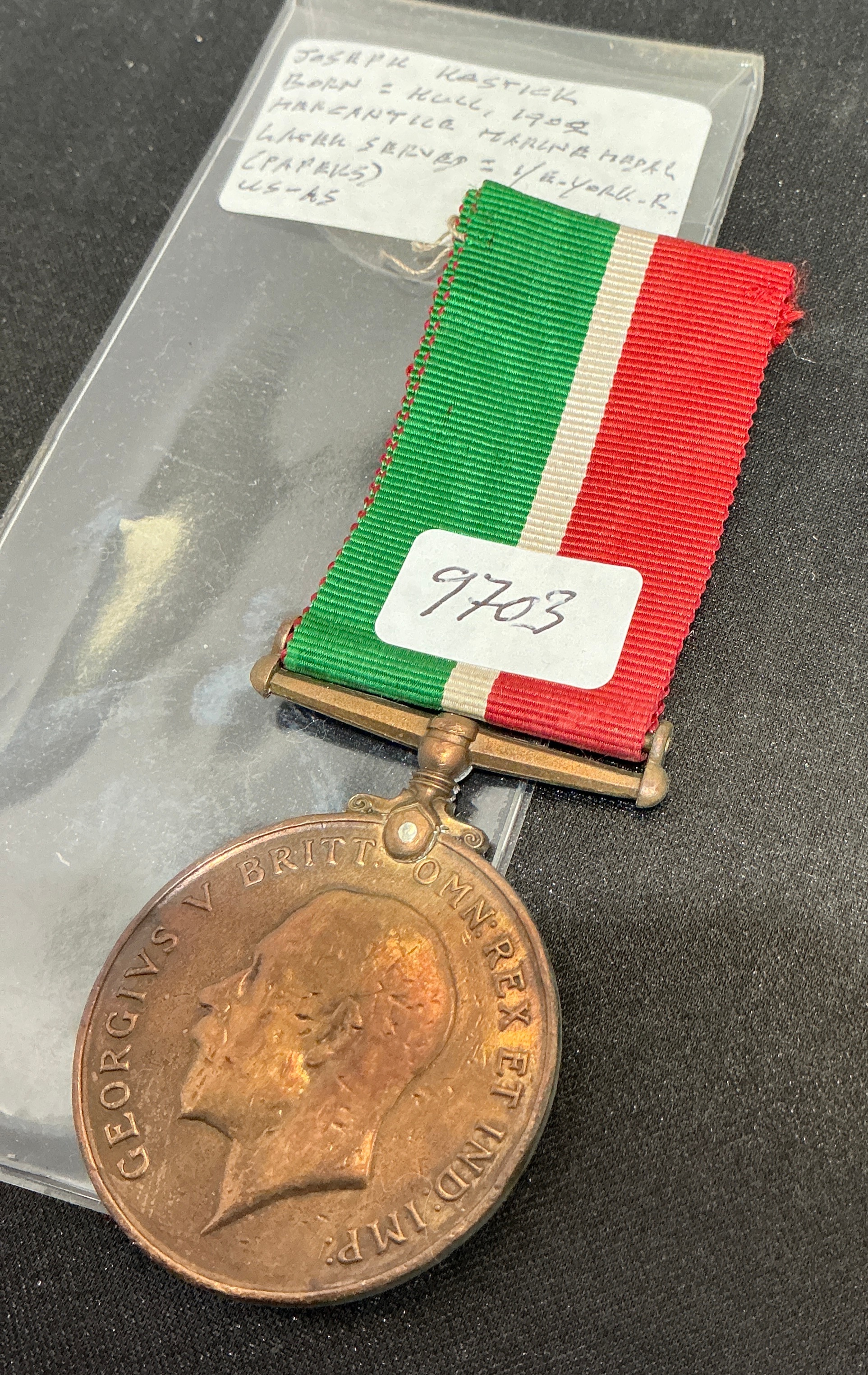 A British First World War Mercantile Marine War Medal, awarded for service at sea during the 1914-1918 conflict. The circular medal is struck in bronze and features a swivel suspension. The obverse depicts the bareheaded effigy of King George V facing left, surrounded by the abbreviated Latin legend GEORGIVS V BRITT: OMN: REX ET IND: IMP:. The reverse shows a merchant steamship traversing heavy seas, with a sinking submarine and a sailing vessel visible in the background. At the base of the reverse is the inscription FOR WAR SERVICE MERCANTILE MARINE 1914-1918. The edge of the medal is officially named in impressed block capitals to JOSEPH RASTICK. It is suspended from its original-style ribbon, consisting of three equal vertical stripes of green, white, and red, representing the port, starboard, and steaming lights of a vessel. The item is accompanied by a handwritten collector’s identification slip indicating the recipient was born in Hull in 1902 and notes service with the 1/5th Battalion, East Yorkshire Regiment. A small white adhesive inventory tag numbered 9703 is attached to the ribbon.