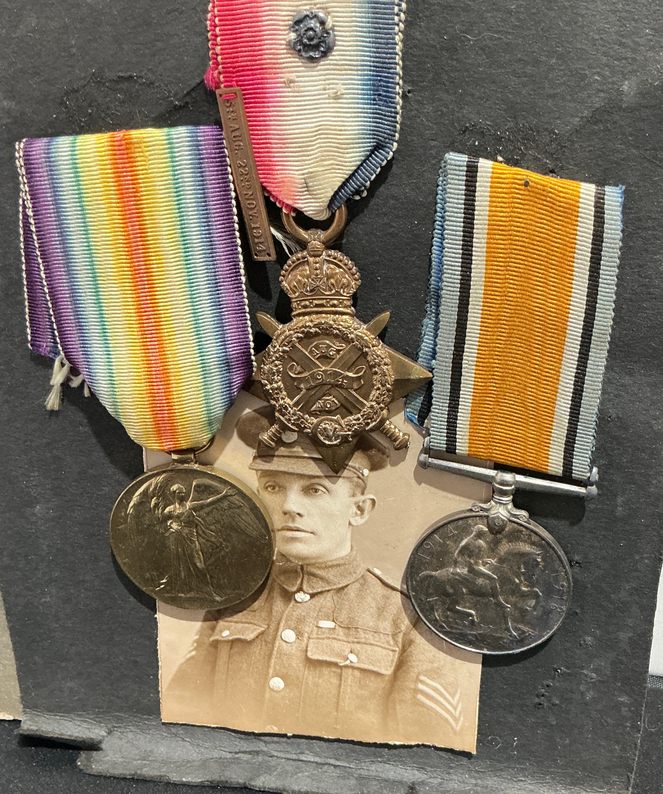 A First World War medal group and associated portrait photograph awarded to a long-serving regular soldier. The collection comprises three medals: a bronze 1914 Star, often referred to as the Mons Star, featuring crossed swords and a crown, fitted with the bronze clasp inscribed 5th AUG. 22nd NOV. 1914 and a silver rosette on the ribbon; a circular silver British War Medal 1914-1918 depicting the profile of King George V; and a circular bronze Victory Medal 1914-1919 with its distinctive rainbow-coloured ribbon. The rims of the British War Medal and Victory Medal are officially impressed with the recipient’s details: 7901 SJT J. W. MOSLEY R. W. FUS. The reverse of the 1914 Star is similarly named to the same individual. Accompanying the medals is a sepia-toned studio portrait photograph of Serjeant Mosley in uniform. The soldier is depicted wearing a peaked cap and service dress tunic, with four inverted good conduct stripes visible on the lower right sleeve, indicating a minimum of thirteen years of exemplary service.