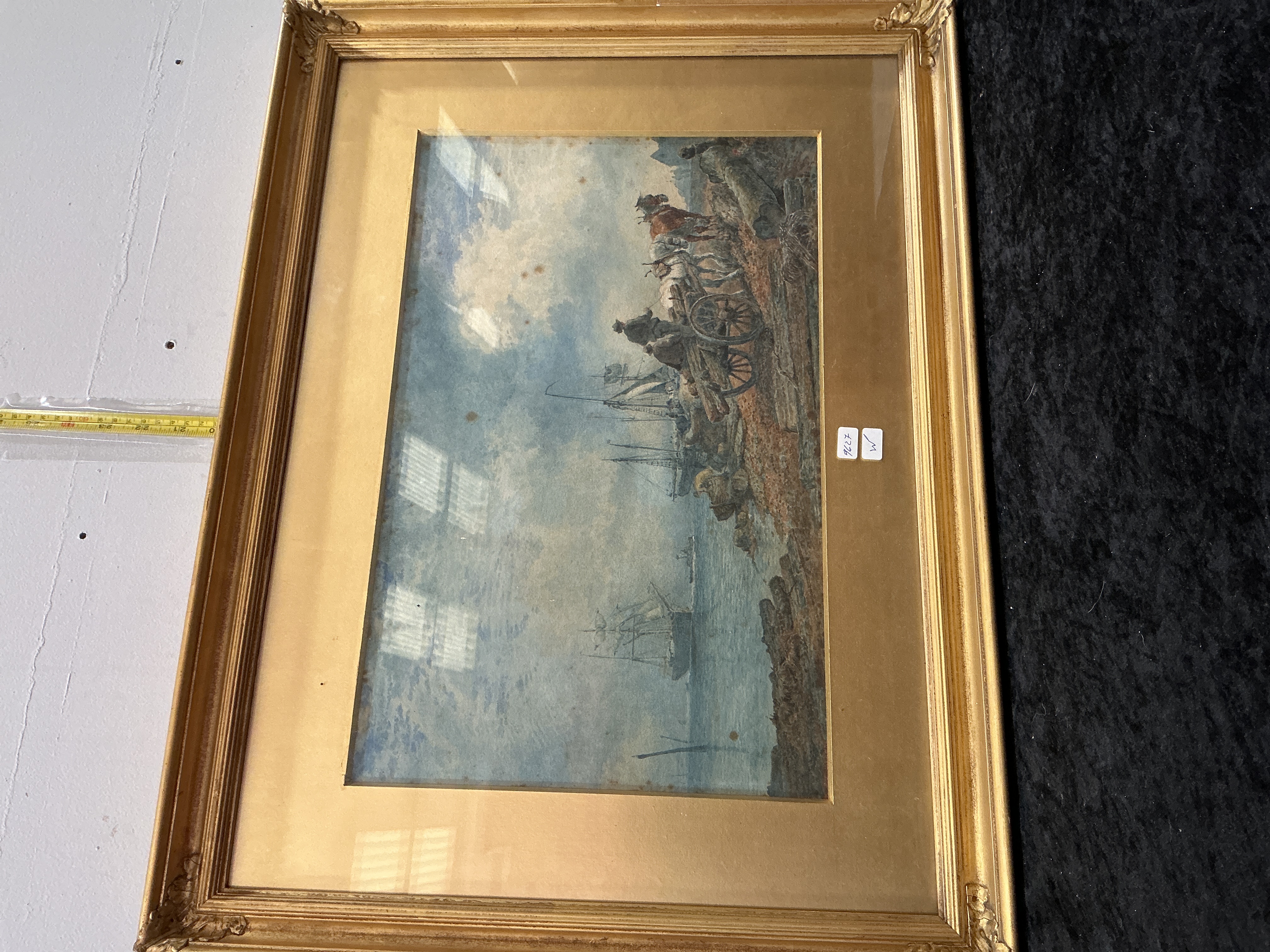 A nineteenth-century maritime watercolour on paper by Clarkson Stanfield, depicting a busy shoreline scene. The foreground features a horse-drawn wagon and several figures on a rocky and sandy bank. In the middle distance and background, several sailing vessels are visible on a calm, hazy sea under a dominant, cloud-filled sky. The work is signed and dated in red ink along the lower right vertical edge: CLARKSON STANFIELD 1841. It is housed in a large, ornate gilded frame with a wide, gold-finished mount.