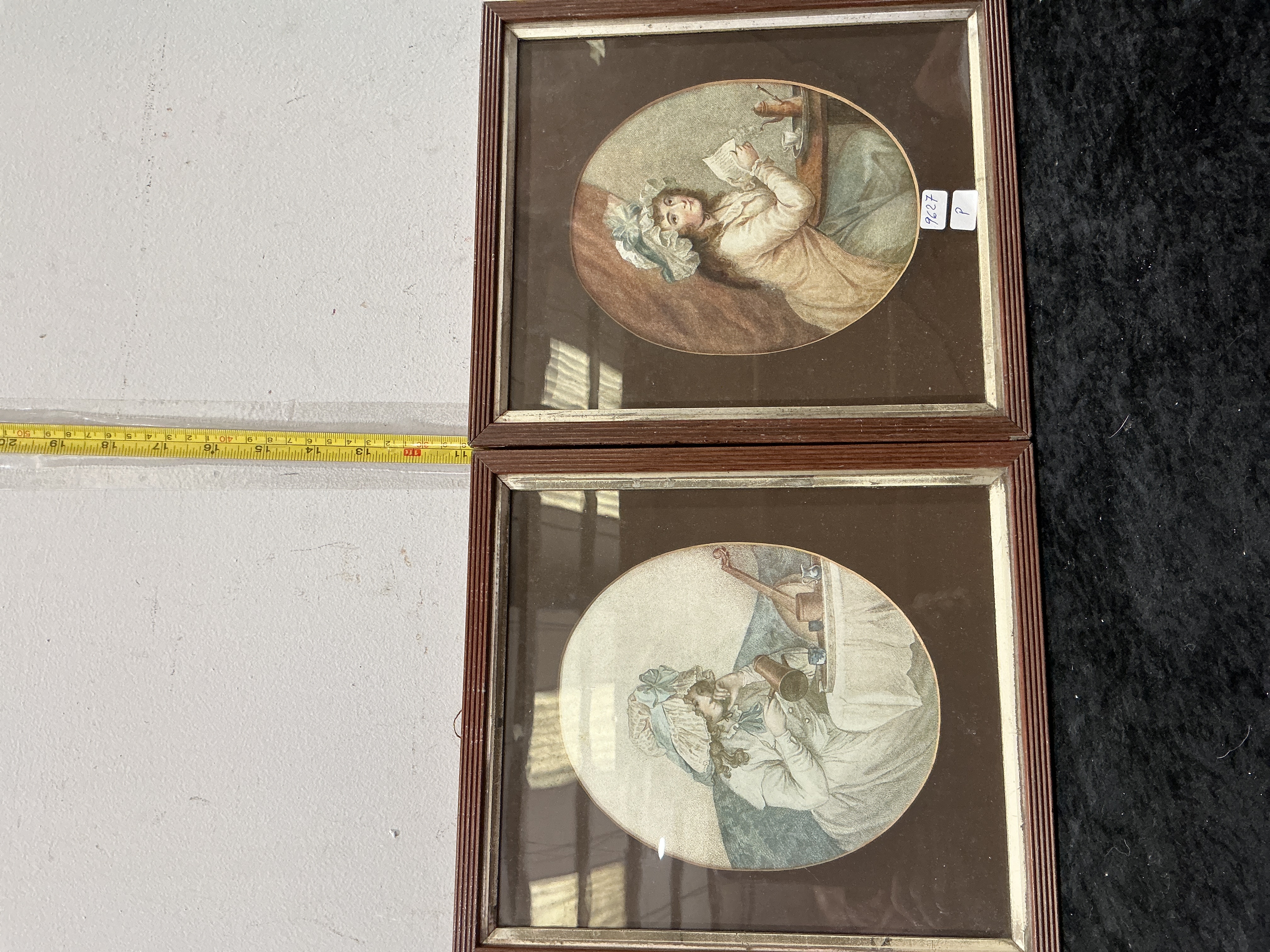 A pair of late 18th-century style stipple engravings, likely printed in colours or hand-coloured, depicting domestic scenes of women in Georgian-period attire within oval vignettes. The upper print portrays a woman in a blue-ribboned mob cap reading a letter at a tea table, while the lower composition features a woman in similar dress at a table with a pitcher. The works are presented in circular formats within dark brown mounts. Both pieces are housed in matching dark wood fluted frames with pale inner slips. No artist signature, plate marks, or publication details are visible through the glass. These works are characteristic of the fancy prints produced by engravers such as Francesco Bartolozzi in the late Georgian period.