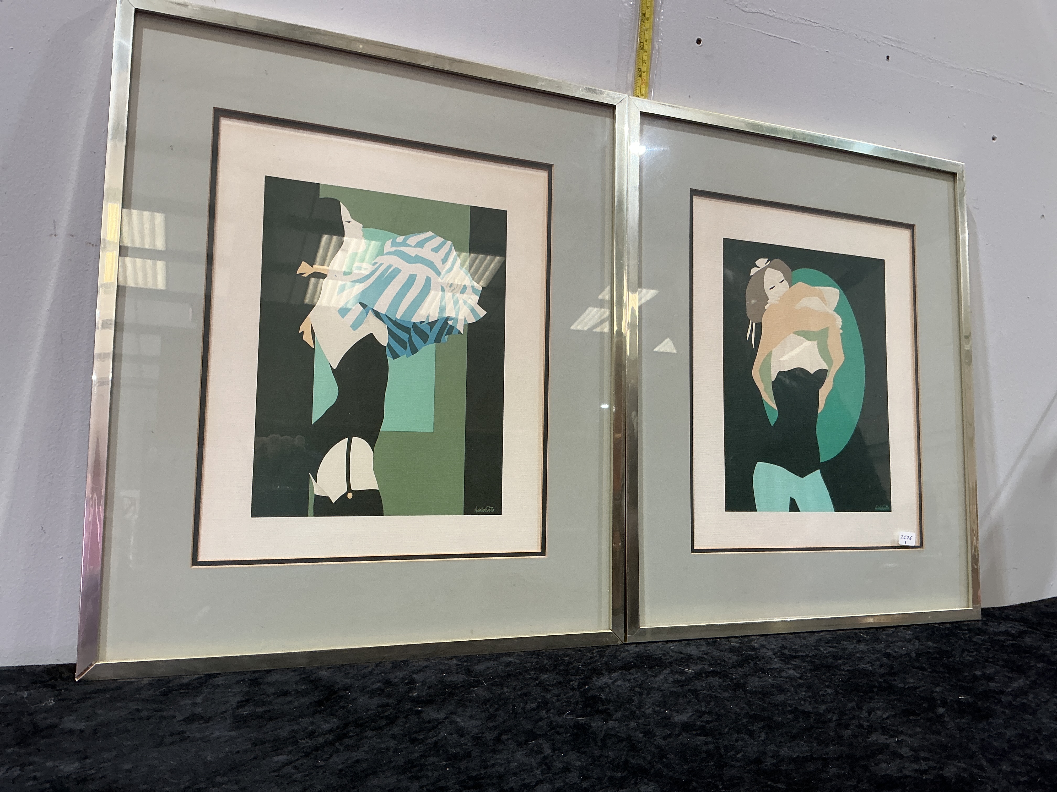 A pair of contemporary screenprints by the Italian artist Amleto Dalla Costa (born 1929), featuring stylized female figures in a graphic, Art Deco-influenced fashion illustration style. One print depicts a woman in black lingerie with suspender straps, holding a blue and white striped garment against a green geometric background. The second print portrays a figure in a black corset and teal trousers with an ochre wrap set against a dark background with a teal oval. Each print is signed by the artist in the lower right corner of the image area. The works are housed in matching gold-toned metal frames with cream-coloured mounts under glass.