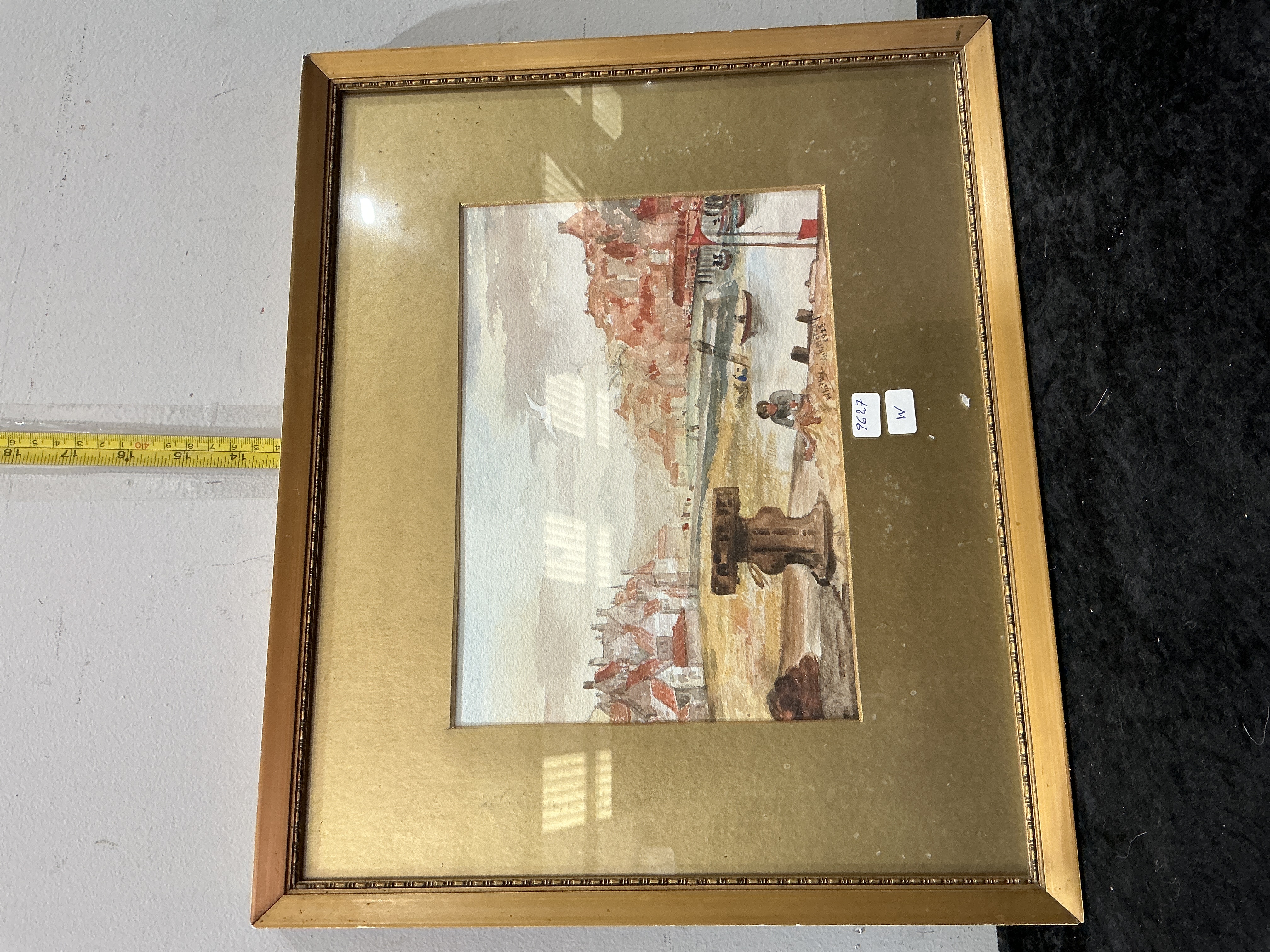 This watercolour with bodycolour highlights on paper depicts a coastal or harbour scene, attributed to the British artist Thurston Laidlaw Shoosmith. The composition features a row of red-roofed cottages clustered along a quayside, with a figure seated in the foreground near a large, dark-toned mooring bollard. The work is executed in an impressionistic style with a soft palette and loose brushwork to capture the atmospheric light of the seaside. A faint, partially legible signature and date are located in the lower-right corner of the painting. The artwork is presented within a wide gold-toned card mount and a gilt-wood frame featuring a beaded inner border. Two adhesive auction labels are present on the right side of the mount: one printed with 7627 and another hand-marked with the letter W.