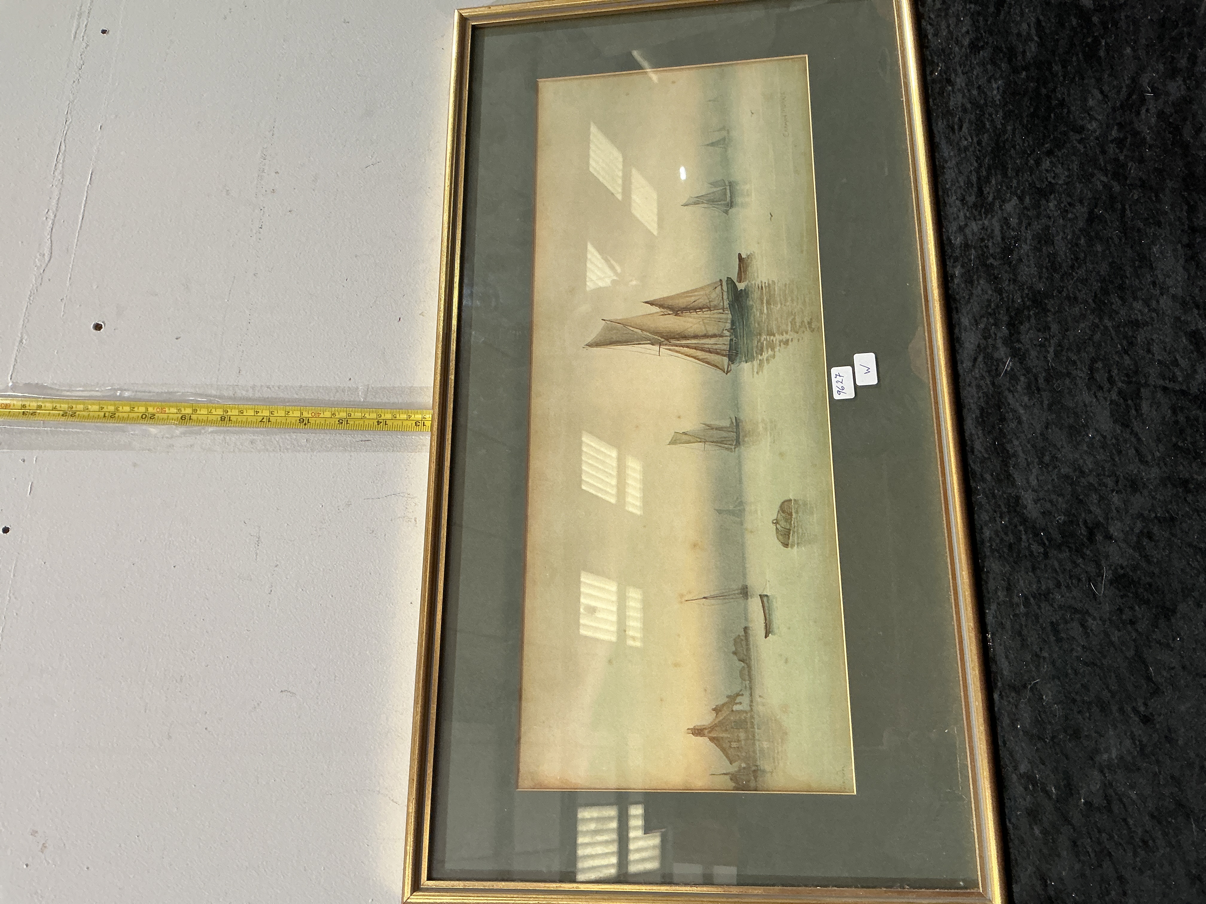 An early 20th-century nautical water colour on paper by Garman Morris. The atmospheric composition depicts several sailing vessels, including a prominent two-masted schooner and smaller fishing craft, resting on calm waters under a hazy, overcast sky. The work is executed in a delicate style with soft washes of colour characteristic of the artist. It is signed Garman Morris in the upper right corner. The painting is presented in a dark green mount and housed in a slim gilt wood frame.