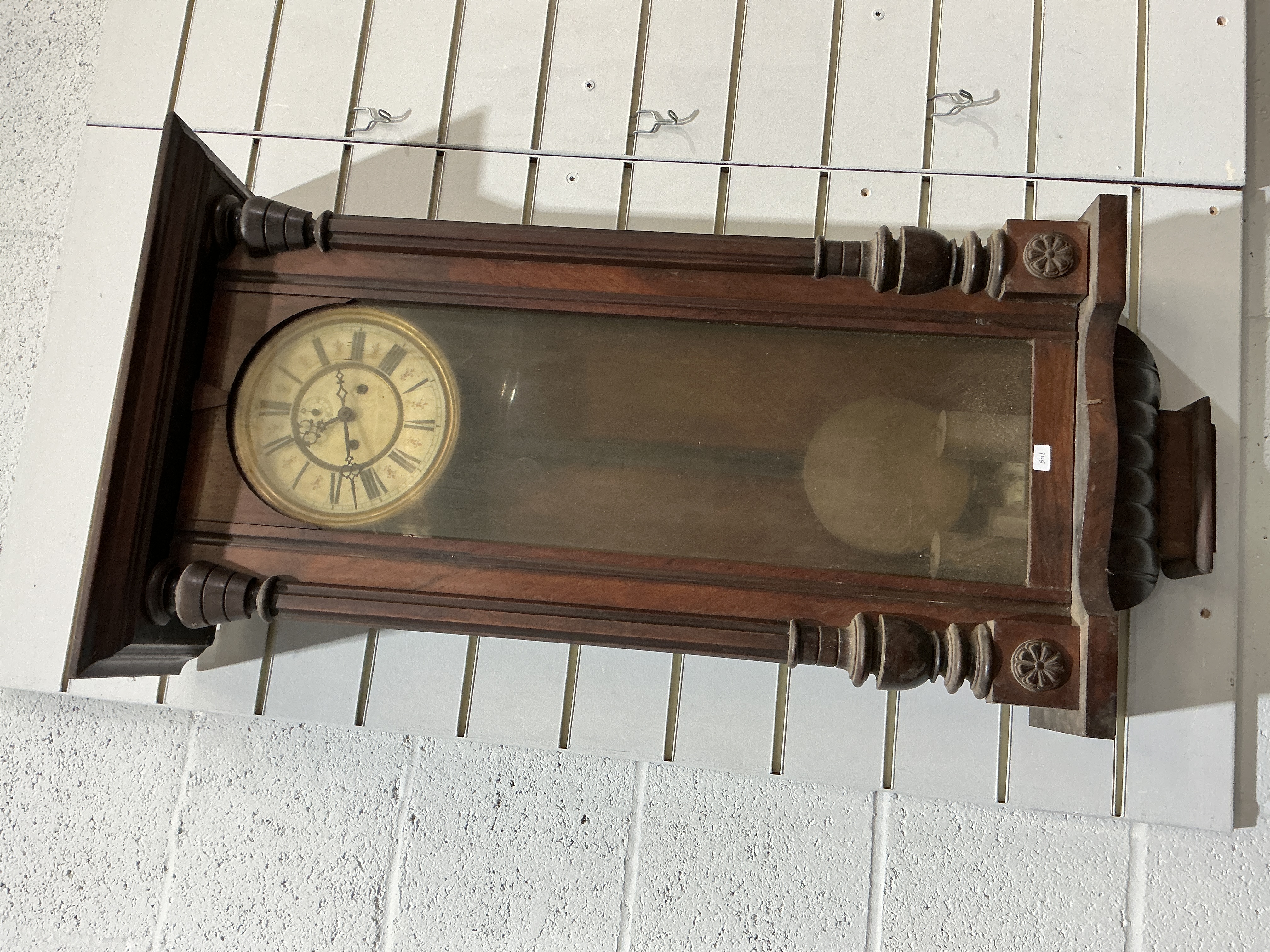 A late 19th-century wall-mounted regulator clock in the Vienna style. The case is constructed from wood with a dark finish, likely walnut, and features architectural elements including turned side pilasters, a moulded pediment, and decorative carved floral bosses. A long glazed door provides a view of the dial and internal components. The circular dial is set within a brass bezel and comprises a cream-coloured chapter ring with black Roman numerals and a minute track. The centre of the dial features ornate pressed brass decoration and includes a subsidiary dial below the twelve o’clock position. Two winding holes are present on the dial, indicating a twin-train mechanical movement. A large circular pendulum is visible within the case, currently resting at the base. A small white rectangular sticker with the handwritten number 501 is attached to the right side of the case.