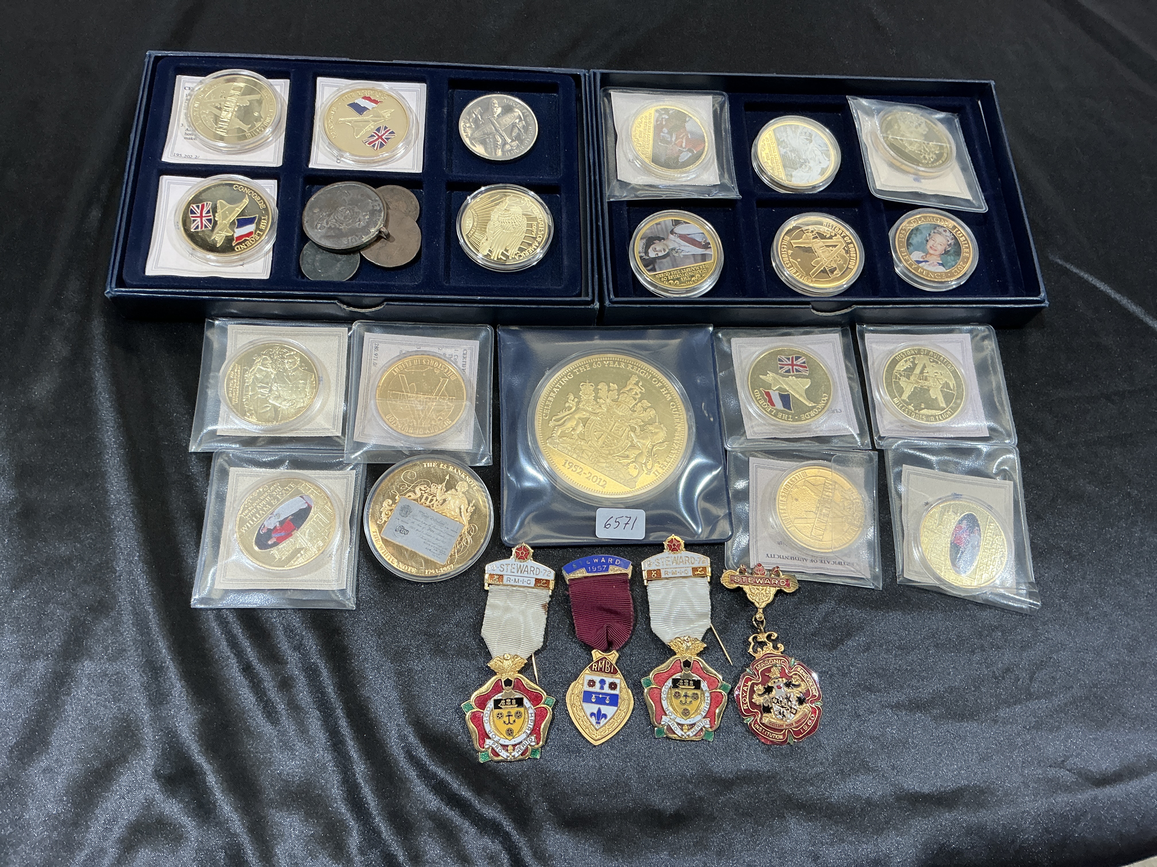 A collection of United Kingdom commemorative numismatic items and Masonic steward jewels. The assembly includes various gold-coloured and silver-coloured medallions and coins, many preserved in protective capsules, individual plastic sleeves, and two blue display trays. A prominent central medallion commemorates the Diamond Jubilee of HM Queen Elizabeth II (1952-2012). Other numismatic pieces feature designs such as the Concorde aircraft with national flags and royal heraldic motifs. Included are several enamel steward jewels attached to ribbons with pin fasteners. These jewels feature inscriptions for the Royal Masonic Institution for Girls, the Royal Masonic Benevolent Institution, and the Royal Masonic Institution for Boys, with visible dates including 1957, 1960, and 1972. The jewels are constructed from gilt metal with multi-coloured enamel detailing.