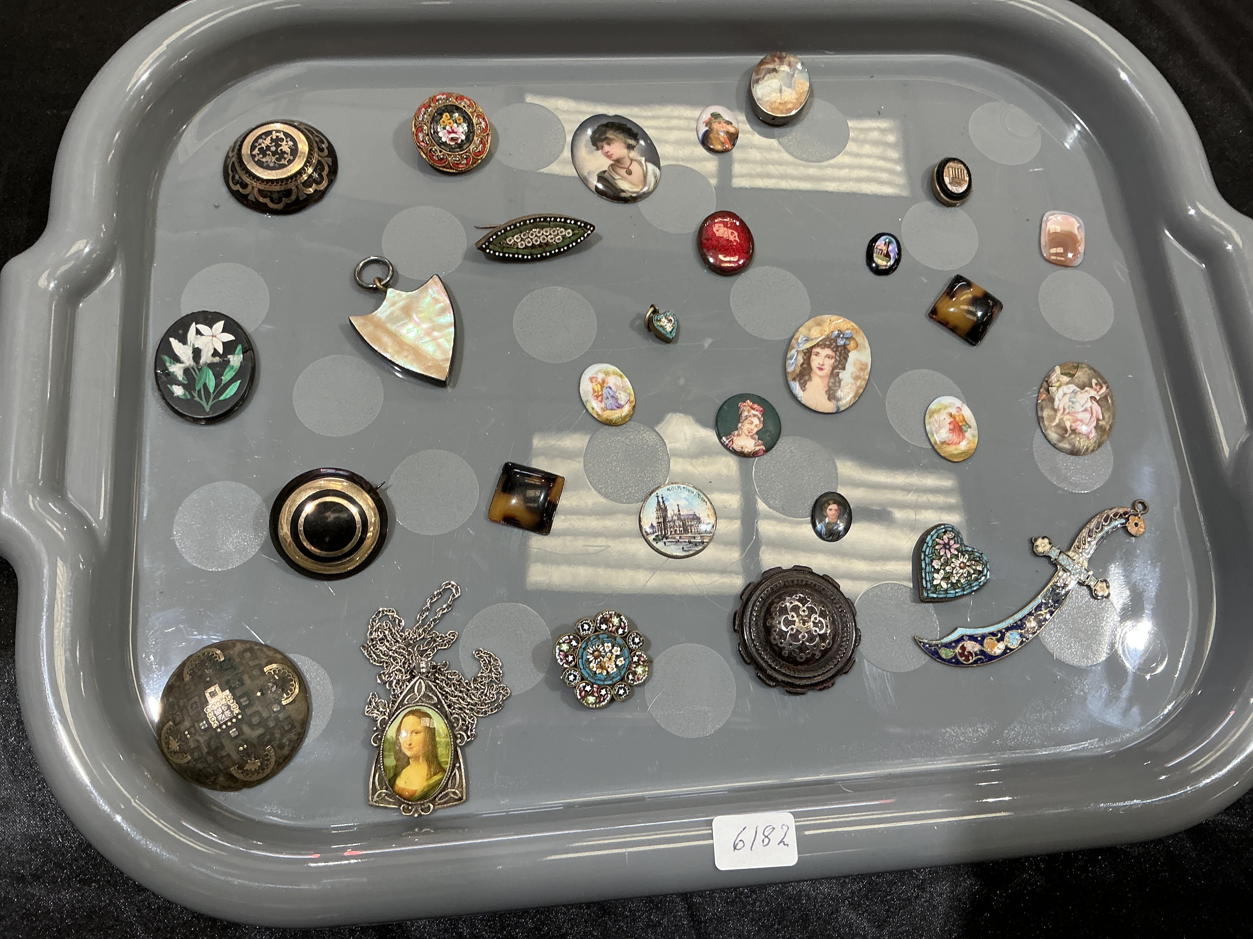 A varied collection of costume jewellery comprising approximately twenty-five items, predominantly brooches and pendants, presented on a display tray. The collection includes a significant selection of portrait miniature brooches and pendants in oval and circular forms, depicting women in various styles of historical dress. These are executed using hand-painted and transfer-printed techniques on ceramic, enamel, and synthetic grounds. Notable within this group is a white metal pendant featuring a depiction of the Mona Lisa, suspended on a fine link chain.
