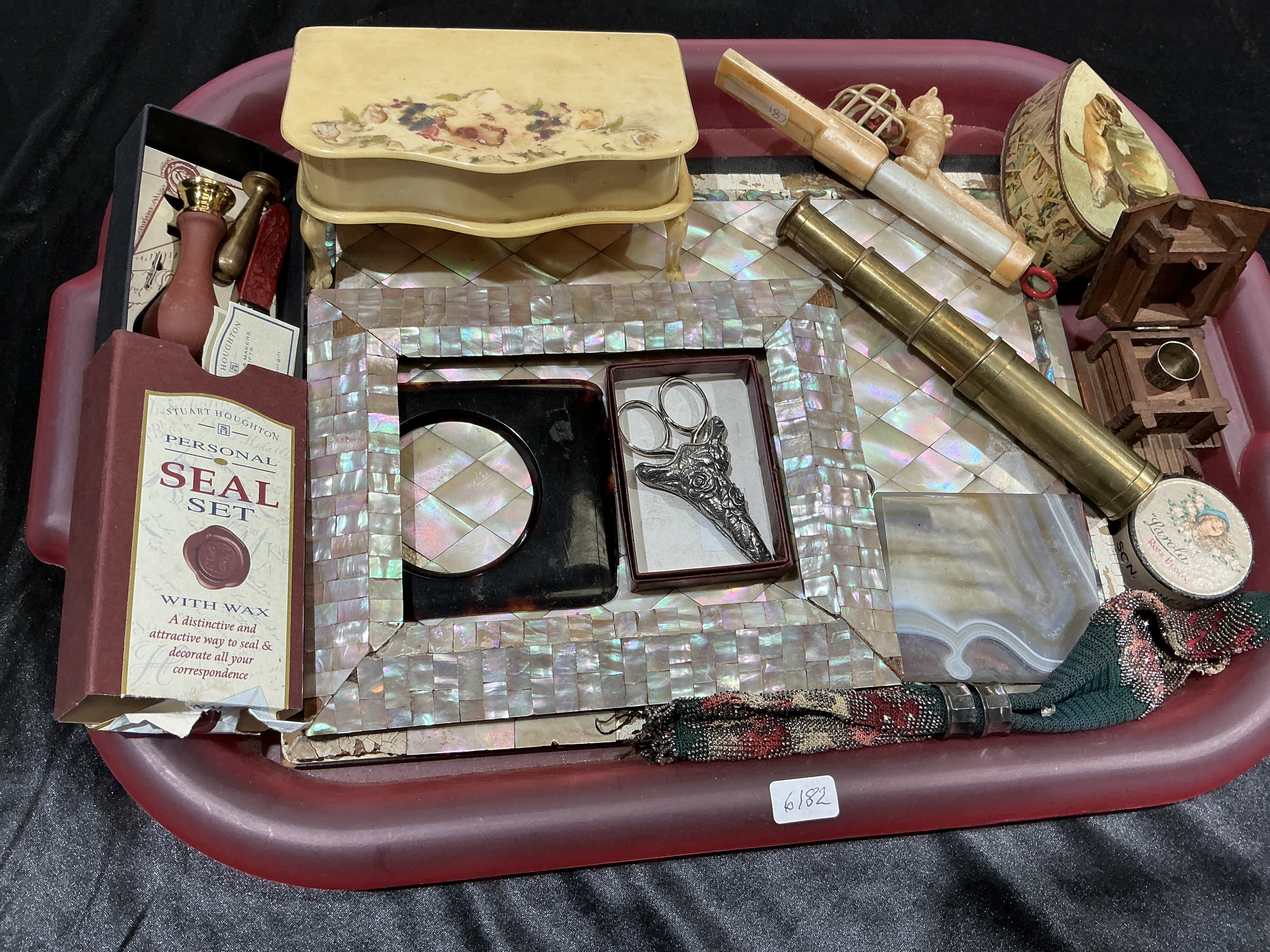 An assortment of antique and vintage desk accessories, stationery items, and curiosities. The collection includes mother-of-pearl inlaid pieces in the Palais Royal style, notably a rectangular frame with geometric diamond-patterned inlay and an associated inlaid surface or stand, both exhibiting a characteristic iridescent lustre. Contained within the frame is a pair of decorative metal scissors with foliate-patterned handles and a tortoiseshell-effect celluloid insert with a circular aperture. The lot features a Stuart Houghton personal seal set in its original red and cream card box, containing a wooden-handled brass seal and sticks of red sealing wax. A vintage cream-coloured writing instrument or tool, likely constructed from celluloid, features a finial carved in the form of a dog and a screw-cap barrel marked with the number 180. Additional items include a three-draw brass pocket telescope, a polished rectangular slab of banded agate in shades of grey and white, and a miniature cream-coloured bombe-fronted trinket box with floral lid decoration. The collection is completed by a small wooden architectural model or watch stand, an oval decorative tin with animal illustrations, and a beaded textile drawstring pouch. The seal set bears the manufacturer mark for Stuart Houghton, Worcester, England. A lot tag numbered 6182 is present.