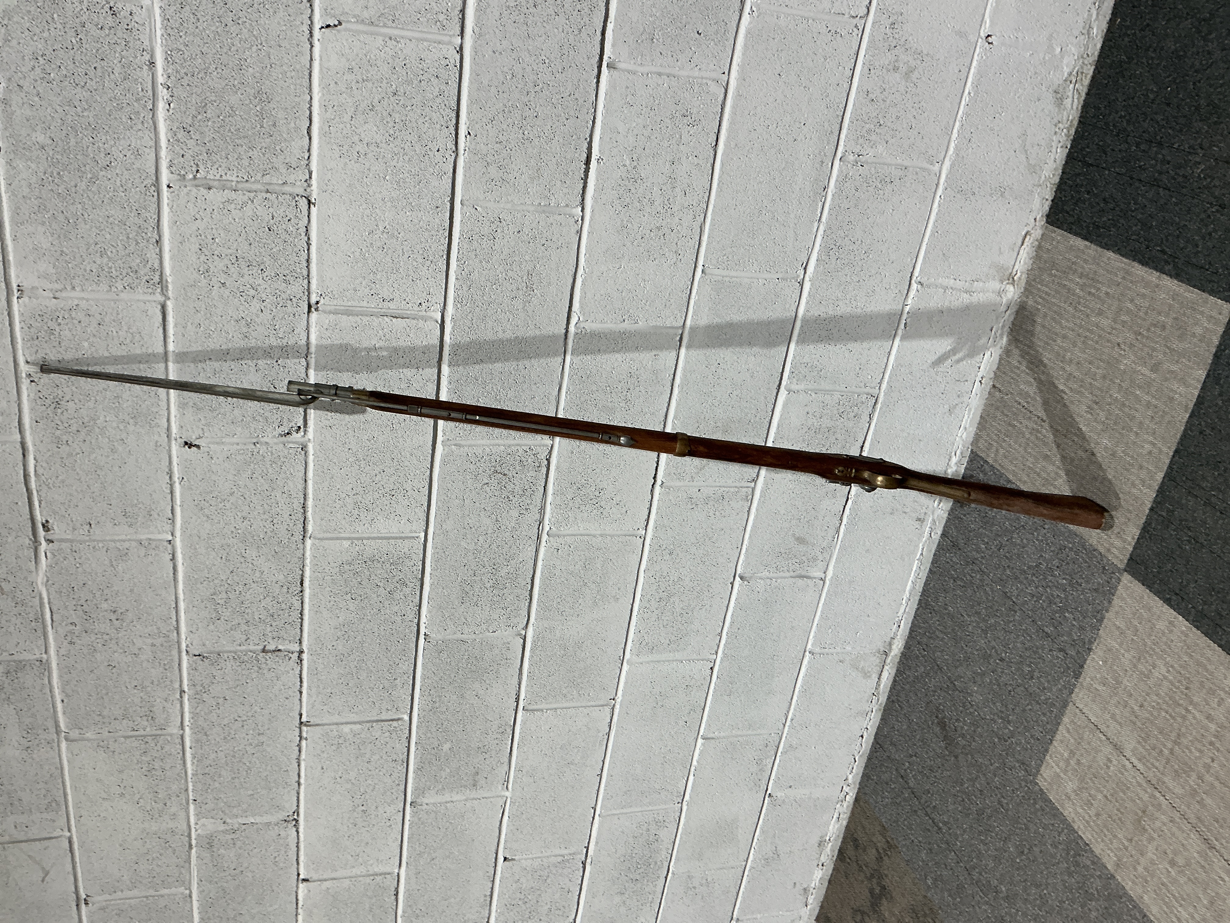 A single muzzle-loading flintlock musket, this item is a reproduction of the iconic British Short Land Pattern Brown Bess and is equipped with an attached socket bayonet. The firearm features a full-length wooden stock with brass furniture, including the trigger guard, side plate, butt plate, and ramrod pipes. The barrel, lock mechanism, and bayonet exhibit a greyish patina with signs of oxidation and minor surface pitting. Key markings include the characters TOWER behind the cock and a crown symbol over the characters GR in front of the cock, replicating standard 18th-century British military patterns for Georgius Rex. A steel ramrod is present in its channel beneath the barrel. This item is identified as a replica musket, commonly used for historical reenactment or decorative display. No specific modern manufacturer markings are evident on the exterior surfaces, maintaining a period-correct appearance.