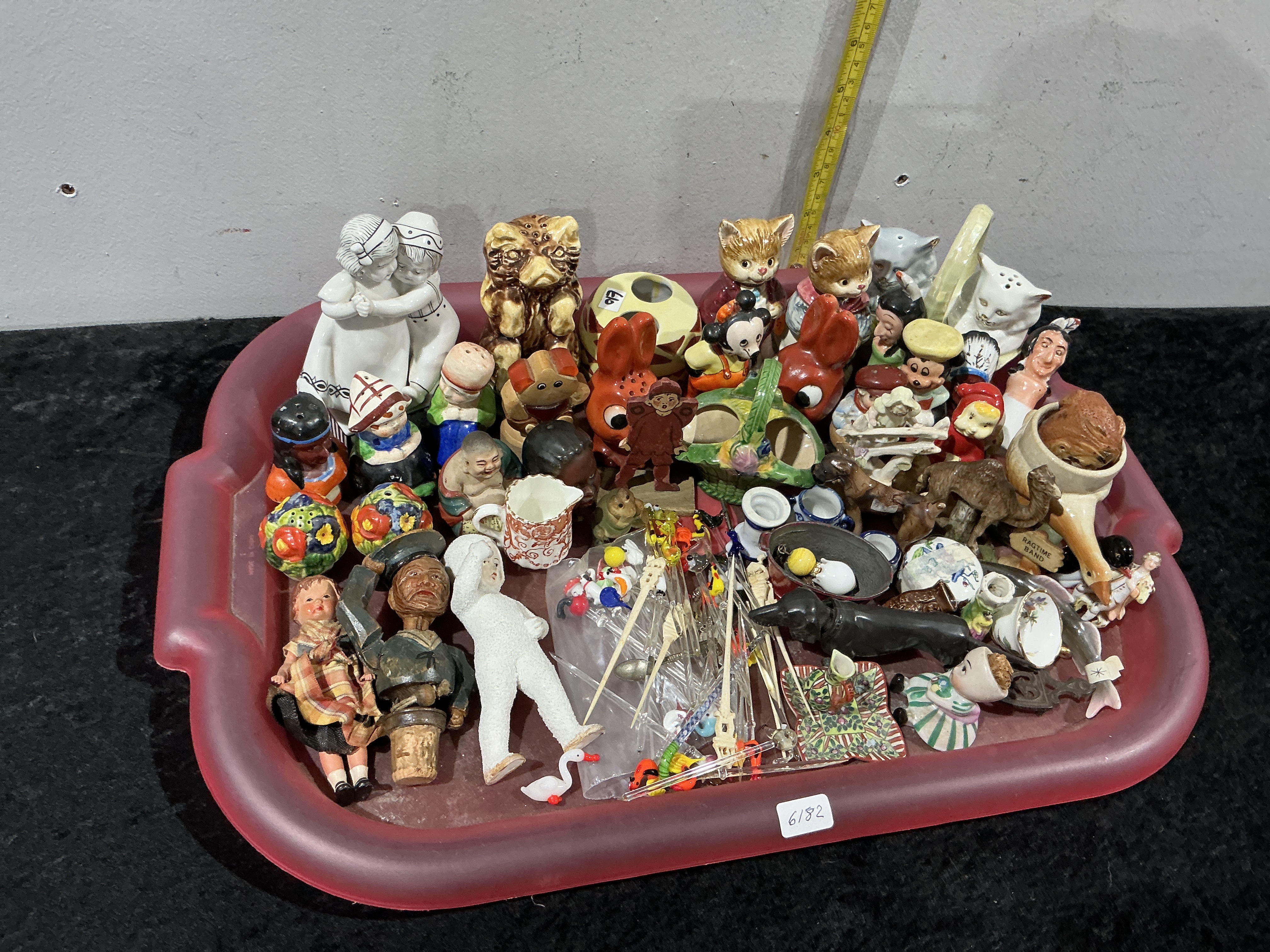 An assortment of vintage and antique miniature figurines, small decorative objects, and collectibles. The lot includes various glazed ceramic anthropomorphic animal figures, including ginger and grey tabby cats, red and orange rabbits, and a brown bear. Human figures feature a pair of white porcelain children in an embrace, a small doll in a plaid dress, and several character busts. Also present is a white bisque figure of a reclining child in the Snow Baby style. Miniature tableware includes a small floral-patterned cream jug and fragments. Miscellaneous items include a collection of glass cocktail stirrers with coloured accents in a plastic bag, a carved wooden bottle stopper in the form of a man’s head, a black glazed dachshund figure, and a porcelain figure holding a sign for the Ragtime Band. A small white duck figure is also included. A small white adhesive label on the front of the tray is marked 6182.