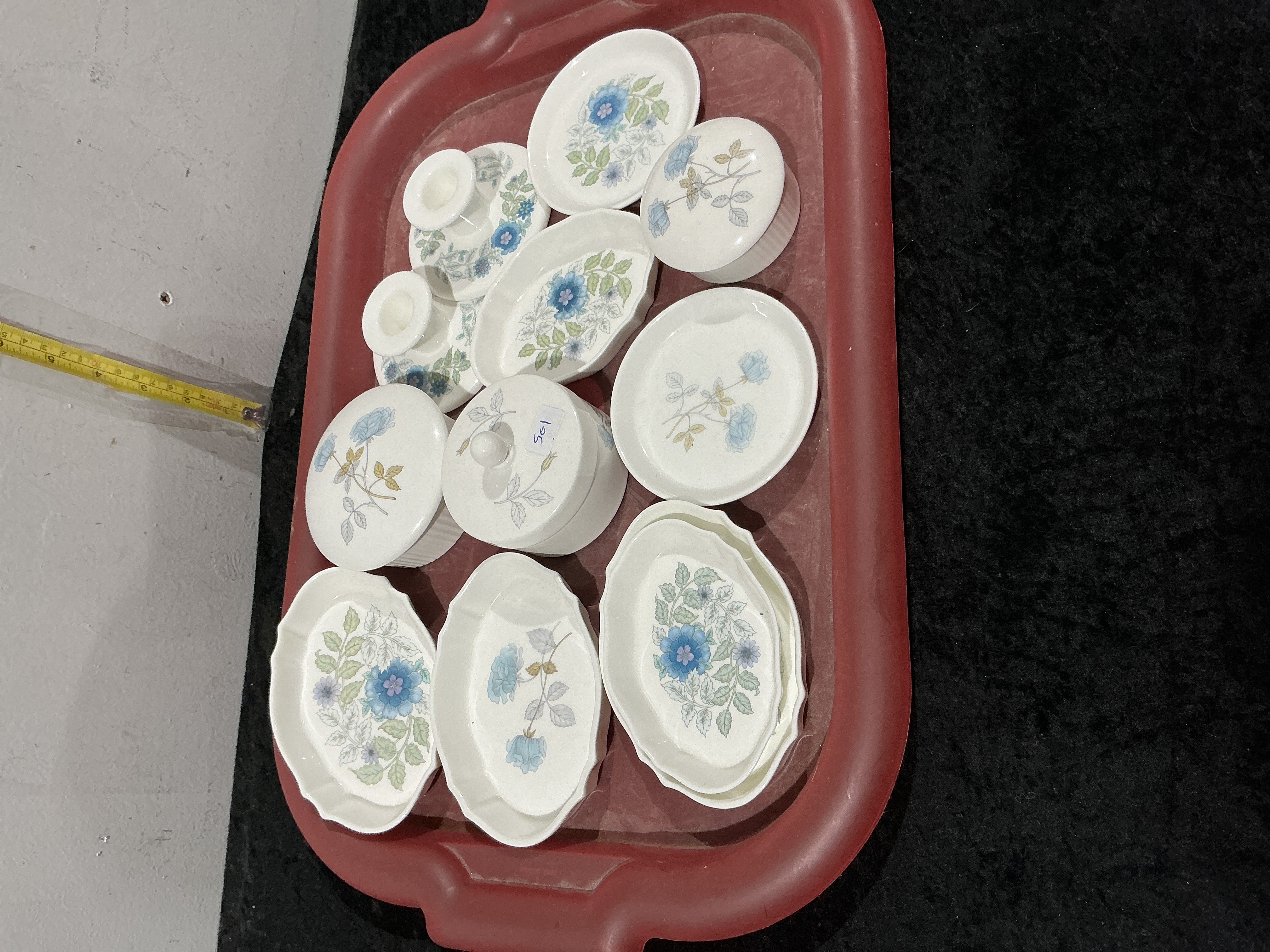 A set of Wedgwood fine bone china dressing table ware decorated in the Ice Rose pattern. Each item features transfer-printed floral sprays of blue roses with green and grey foliage on a white glazed ground. The collection includes candlesticks, circular lidded trinket pots, small circular dishes, and an assortment of oval dishes and pin trays, several with lobed or scalloped rims. One lidded pot has a small white adhesive label with handwritten characters.