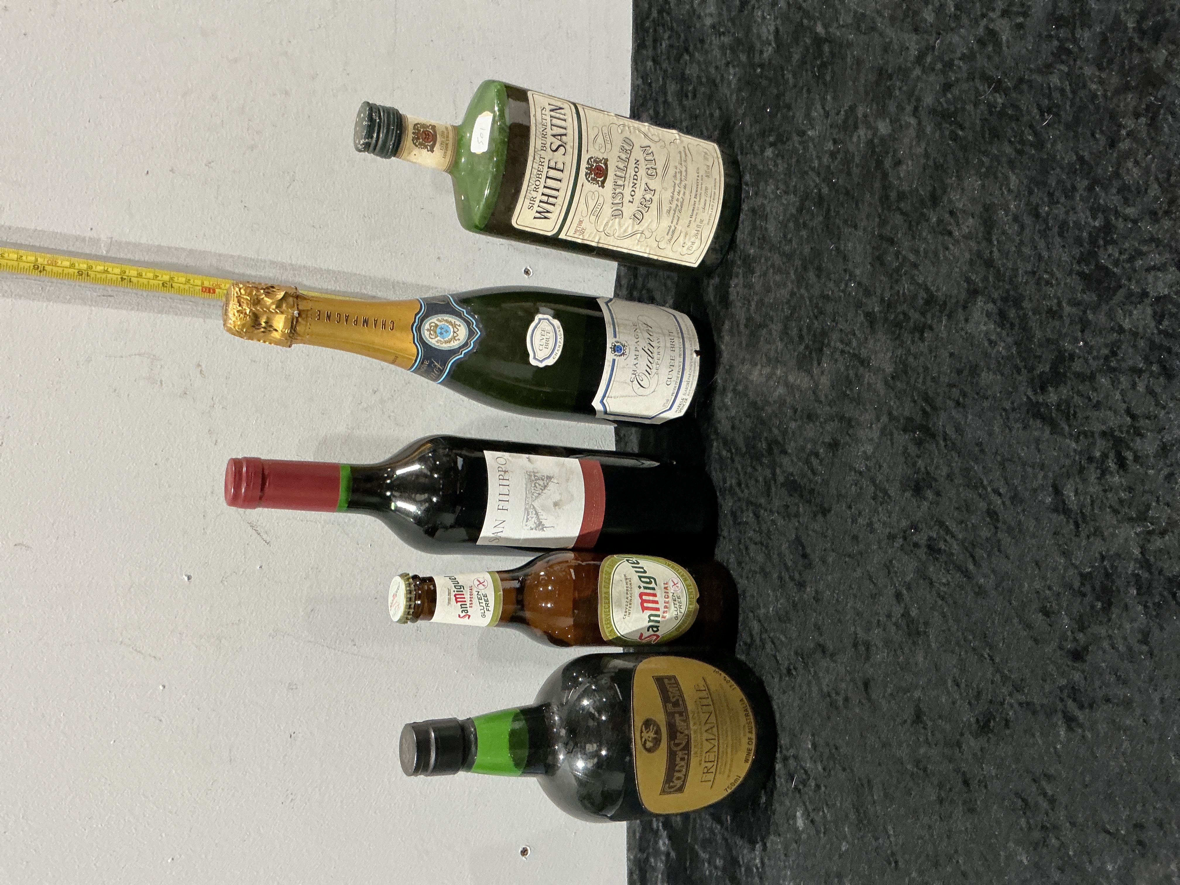 This mixed lot consists of five bottles of various alcoholic beverages. The collection includes a bottle of Sir Robert Burnett’s White Satin Distilled London Dry Gin, featuring dual volume markings of 75cl and 26 2/3 fl oz and a strength of 70% Proof, indicating a late 20th-century bottling. Also present is a 750ml bottle of Champagne Oudinot Cuvée Brut from Épernay, France, complete with its original gold foil and wire cage. The lot further contains a 750ml bottle of San Filippo Italian red wine and a 750ml bottle of Golden Coast Estate Fremantle fortified wine from Western Australia, which indicates an alcohol content of 17.0% vol. Completing the assortment is a 330ml bottle of San Miguel Especial Gluten Free lager.