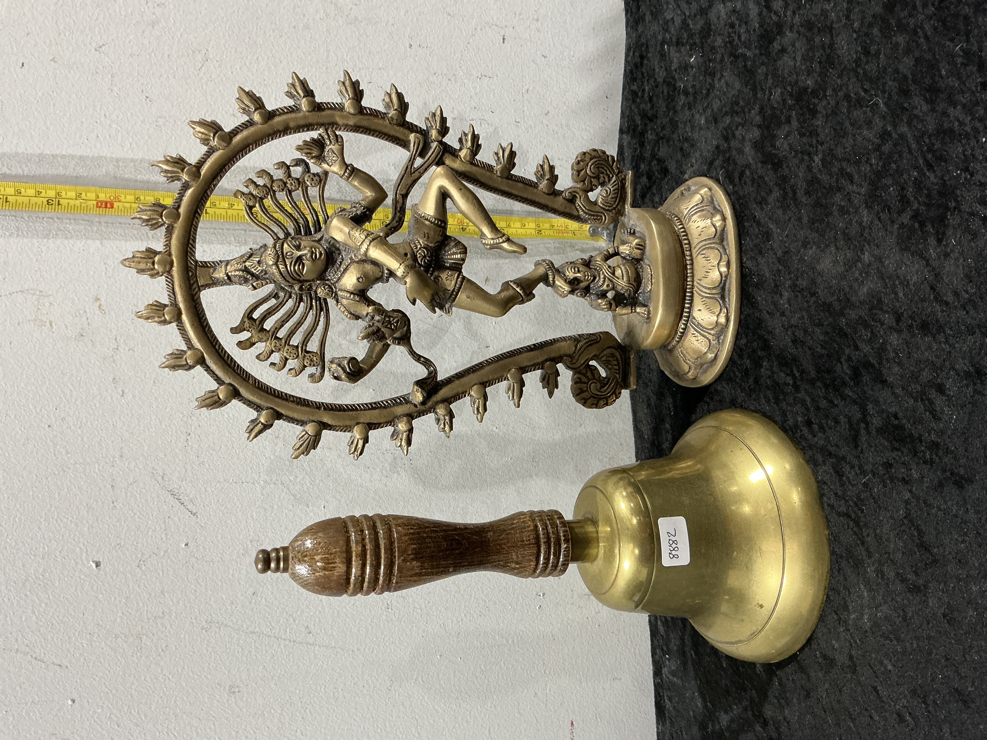 This lot comprises two metal items: a cast brass sculpture of Shiva Nataraja and a hand bell with a turned wooden handle. The sculpture depicts Shiva as the Lord of the Dance in the ananda tandava pose, set within a circular flaming prabhamandala or aureole. The deity is portrayed with multiple arms holding a damaru drum and fire, with one hand in abhaya mudra and another pointing towards his raised foot, while standing upon the dwarf demon Apasmara to symbolise victory over ignorance. The figure is modelled in the classic Chola style of Southern India. The hand bell features a polished brass body and a dark, turned wooden handle. A small white adhesive label with the handwritten number 2882 is present on the exterior of the bell.