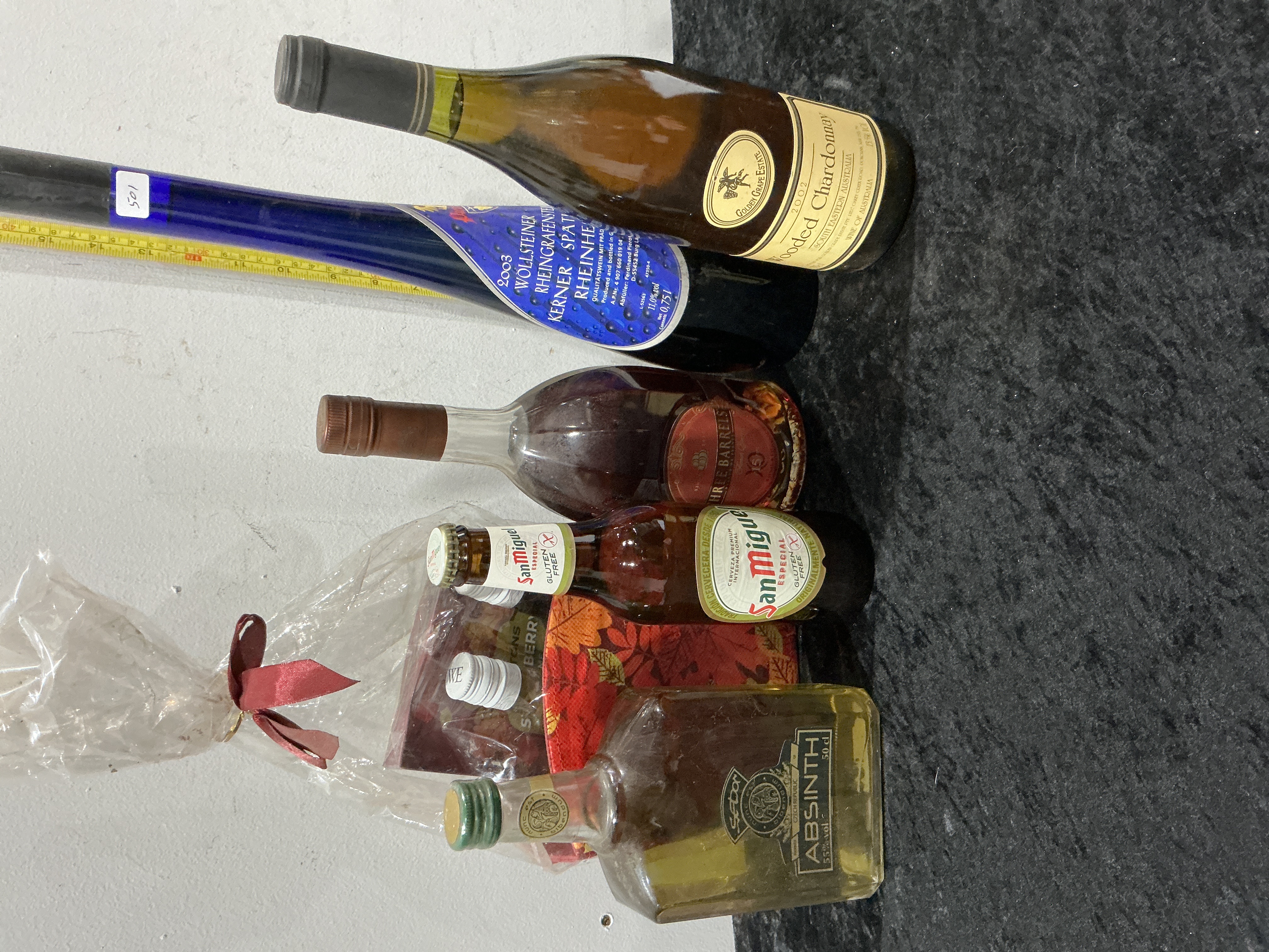 A collection of six assorted bottles of alcoholic beverages comprising wine, spirits, and beer. The group includes a 750ml bottle of Golden Grape Estate Wooded Chardonnay, vintage 2002, from South Eastern Australia. There is a 0.75l bottle of 2003 Wöllsteiner Rheingrafenstein Kerner-Spätlese from Rheinhessen, Germany, produced by Ferdinand Pieroth and presented in a tall blue glass flute bottle. The spirits consist of a bottle of Three Barrels V.S.O.P. Rare Old French Grape Brandy and a 50cl bottle of Sebor Absinth, 55% vol, from the Czech Republic. Also included is a 330ml bottle of San Miguel Gluten Free Lager and a bottle of Mixed Berry liqueur by Lowe, which remains sealed in a decorative cellophane gift bag with a red ribbon bow. Visible markings include various producer names, vintage dates, and regional origins as described on the labels.
