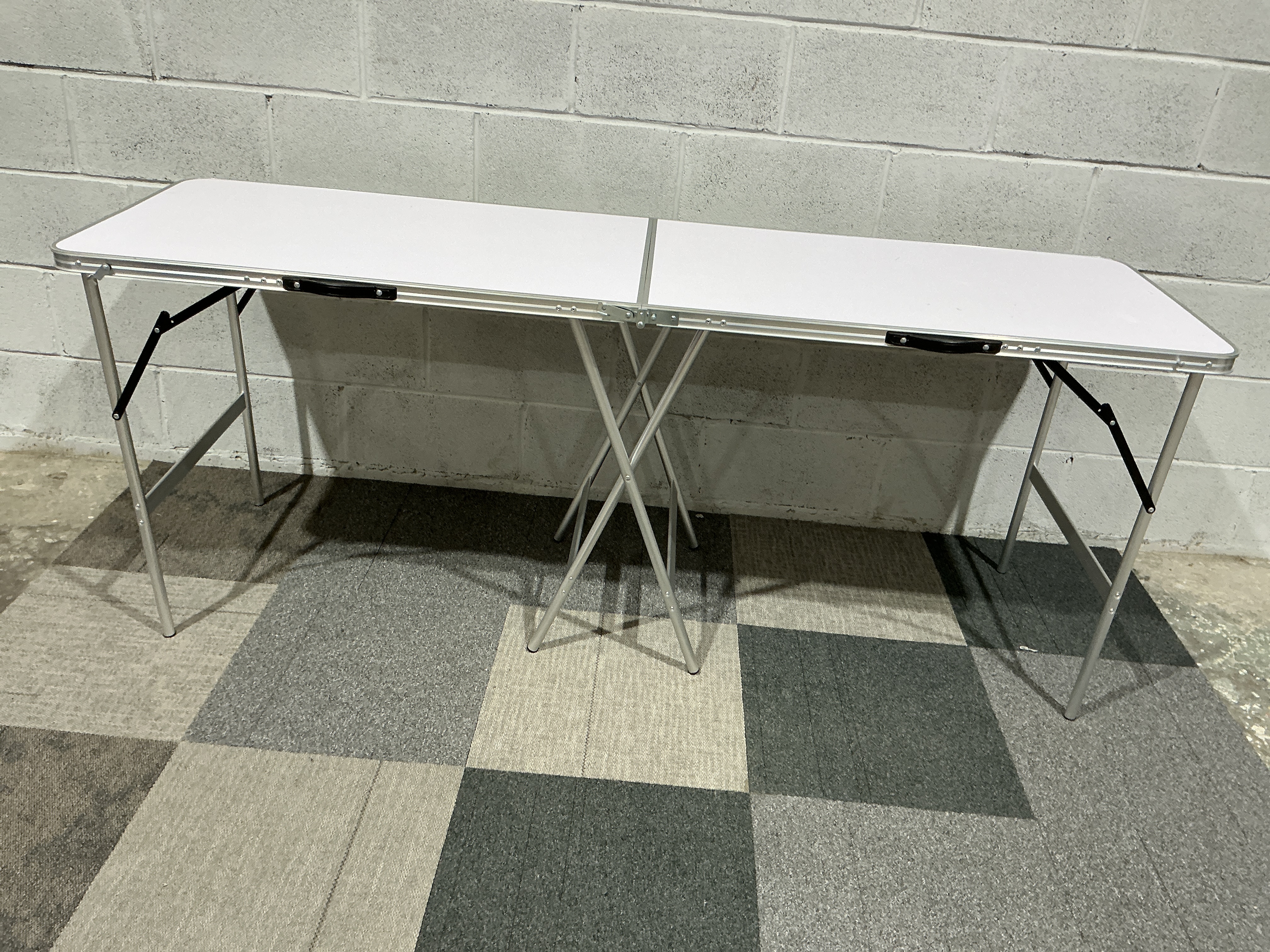 Modern portable folding utility table of a type commonly used for wallpaper pasting, camping, or as a temporary event table. The structure features a white laminate-surfaced top consisting of two panels with protective aluminium edge trimming. The base is constructed from a lightweight aluminium frame supported by three sets of folding tubular legs. The outer leg sets incorporate diagonal locking supports, while the centre features an X-frame support for additional stability. The table is designed to fold in half at a central hinge for storage and transport and is equipped with two black plastic carrying handles on the side.