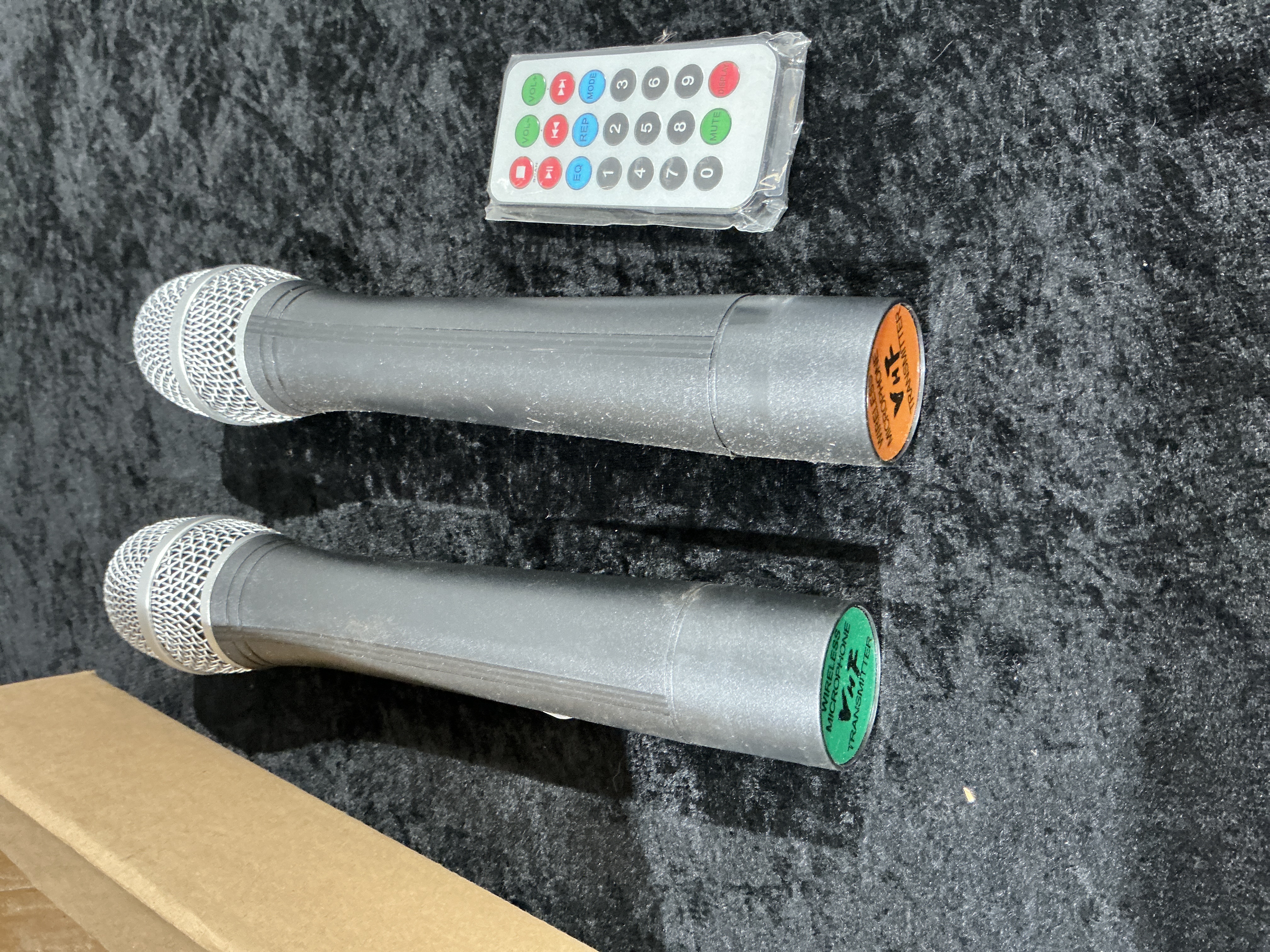 A pair of handheld wireless VHF transmitter microphones and a multi-function remote control. Each microphone features a dark grey plastic housing with a silver-tone mesh grille. The base of each unit is fitted with a colour-coded circular label, one orange and one green, marked with the text WIRELESS MICROPHONE VHF TRANSMITTER. The included slimline remote control is contained within a clear plastic sleeve and provides buttons for volume, mode, and numeric selection. These items are designed for use with compatible public address or karaoke systems.