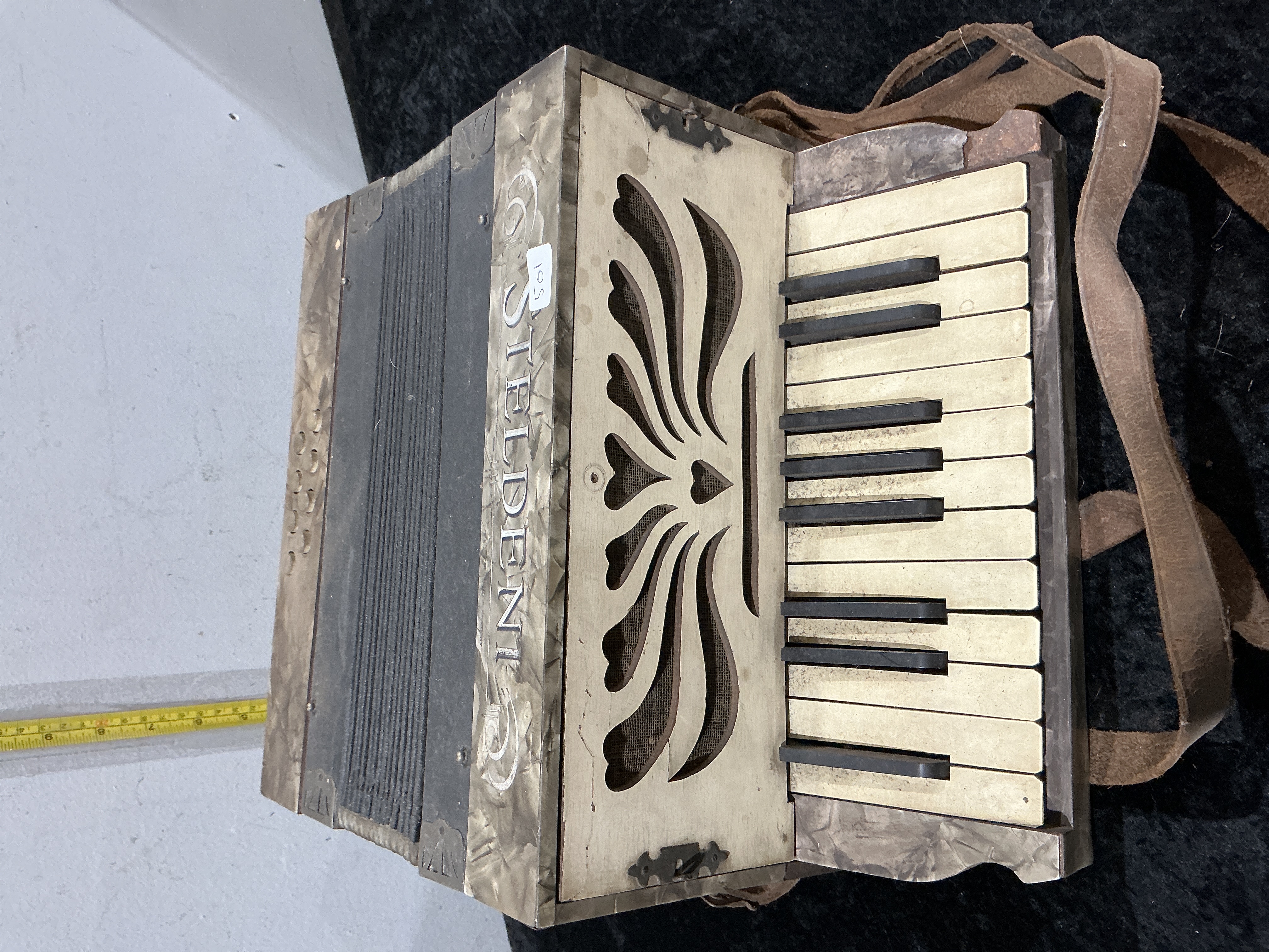 A vintage G. Steldeni piano accordion. The instrument features a decorative casing in a marbled cream and grey celluloid pearloid finish. The keyboard consists of white and black plastic keys. The front grille is constructed from pierced fretwork material with a dark mesh fabric backing. A vertical inscription on the bellows frame reads G. STELDENI. The bellows are made from paper and fabric with black tape and metal corner reinforcements. Two leather shoulder straps are attached.