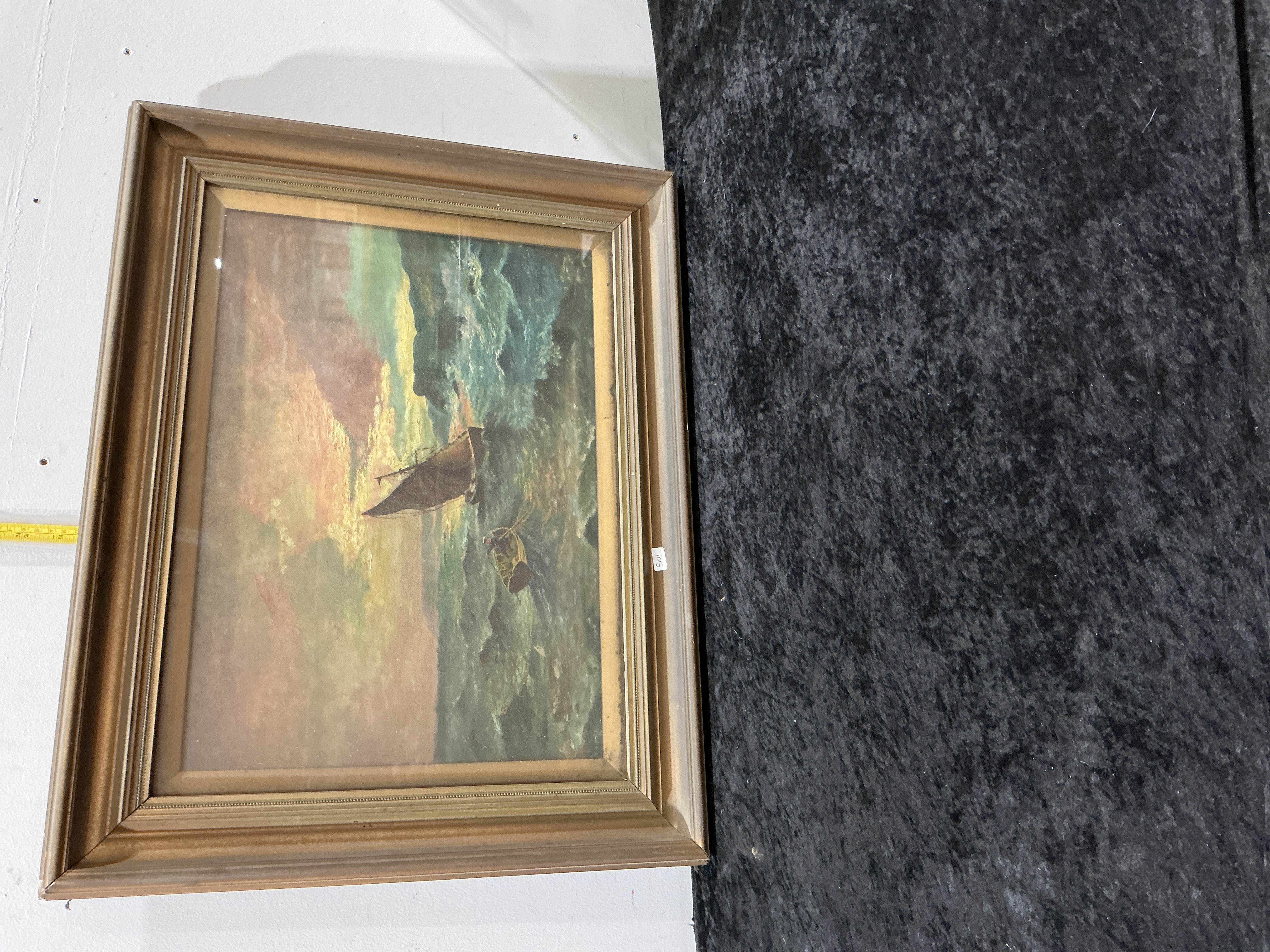 This maritime oil on canvas depicts a single-masted sailing vessel navigating turbulent green waters under a sky rendered in hues of orange and yellow. The work is executed in an impressionistic style with broad, textured brushwork used to define the waves and the lighting of the clouds. The painting is housed in a traditional gilt-finished moulded frame. The reverse of the work reveals an aged canvas on a four-member wooden stretcher with a metal hanging chain attached. A small white sticker printed with the number 105 is visible on the lower right of the frame front.