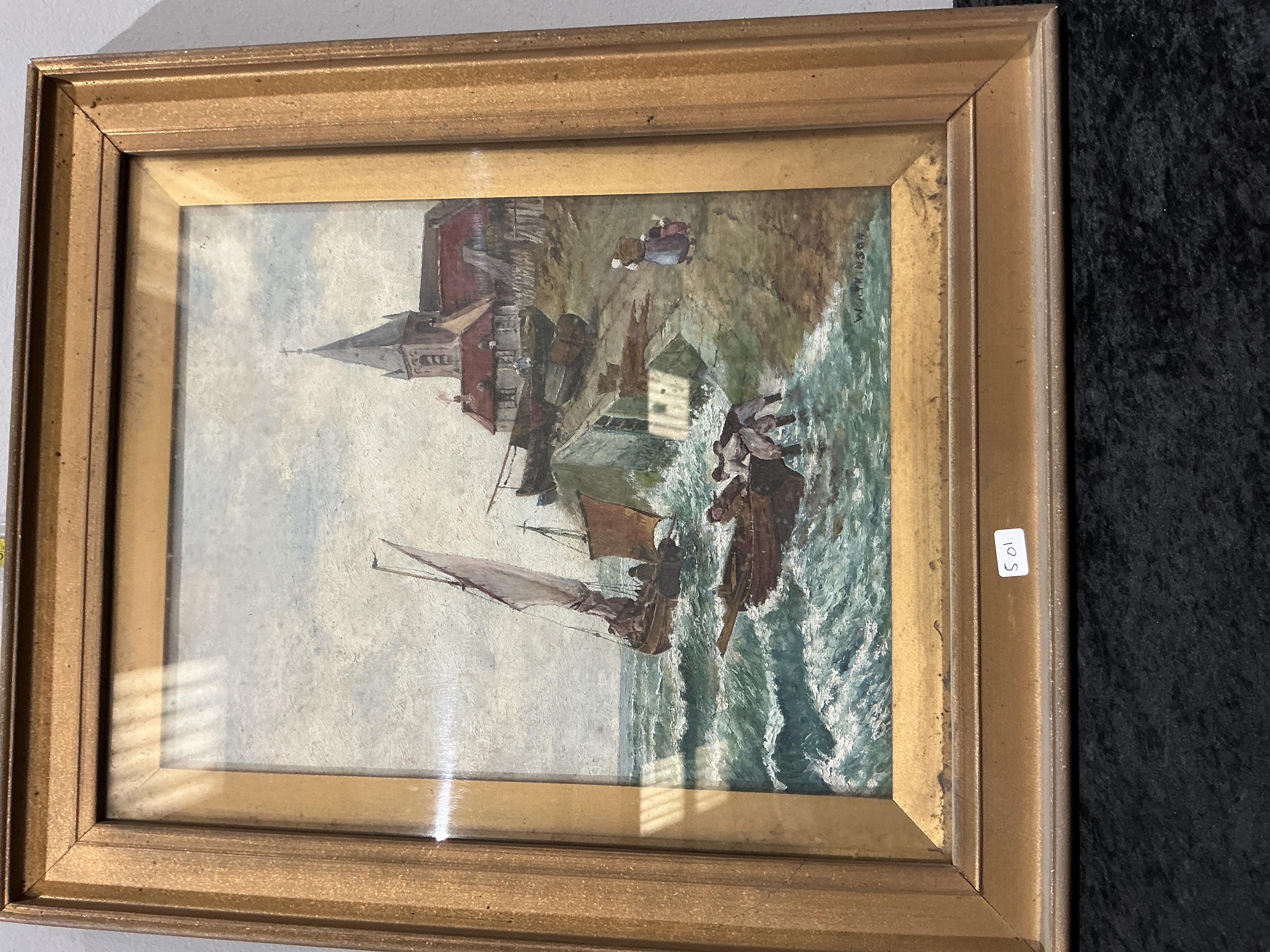 An oil painting on canvas by the artist Watkinson, featuring a signature placed vertically on the right edge and also inscribed on the reverse of the canvas. The scene depicts a coastal maritime landscape with fishing boats in turbulent water near a shoreline. Figures are visible on the coast and in the foreground vessels. In the background, a village with a prominent church spire is shown under a cloudy sky. The work is executed in a realist manner with textured impasto highlights in the white caps of the waves. The painting is housed in a substantial, multi-stepped gilt wooden frame. The reverse of the painting shows the canvas on a wooden stretcher with corner keys.
