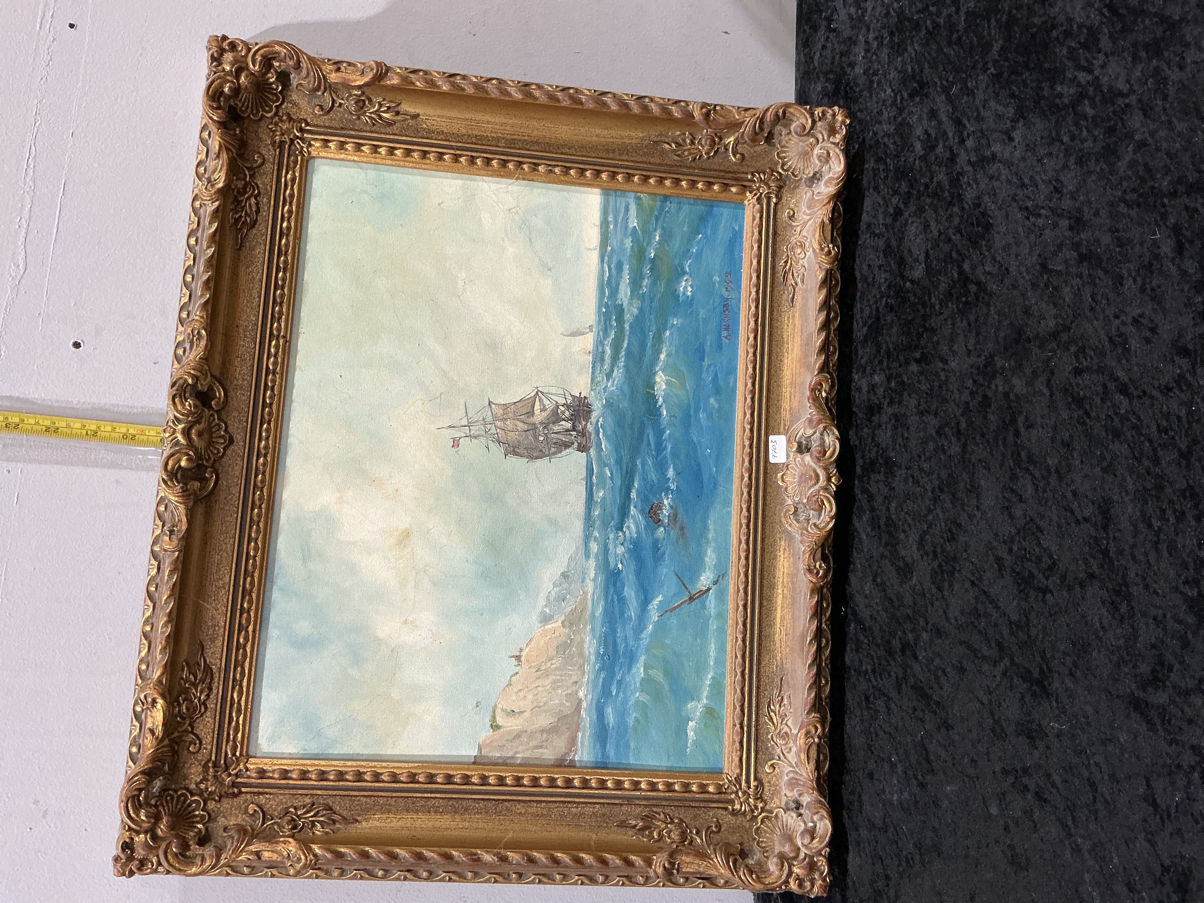 This work is a maritime oil painting on board by the artist A. Marshay, dated 1932. The composition depicts a multi-masted sailing vessel with sails set, navigating a turbulent blue sea. The artist has used fluid brushwork with impasto highlights to represent the white foam of the waves. A rocky, pale-coloured headland is visible in the lower foreground. The sky is rendered with soft, blended clouds in pale tones. The painting is signed and dated A. MARSHAY – 1932 in red paint in the lower right corner. It is presented in an ornate gilt-composition swept frame featuring pierced scrollwork, shell motifs, and acanthus leaf detailing. The reverse of the board is covered with aged brown paper and fitted with a red hanging cord.