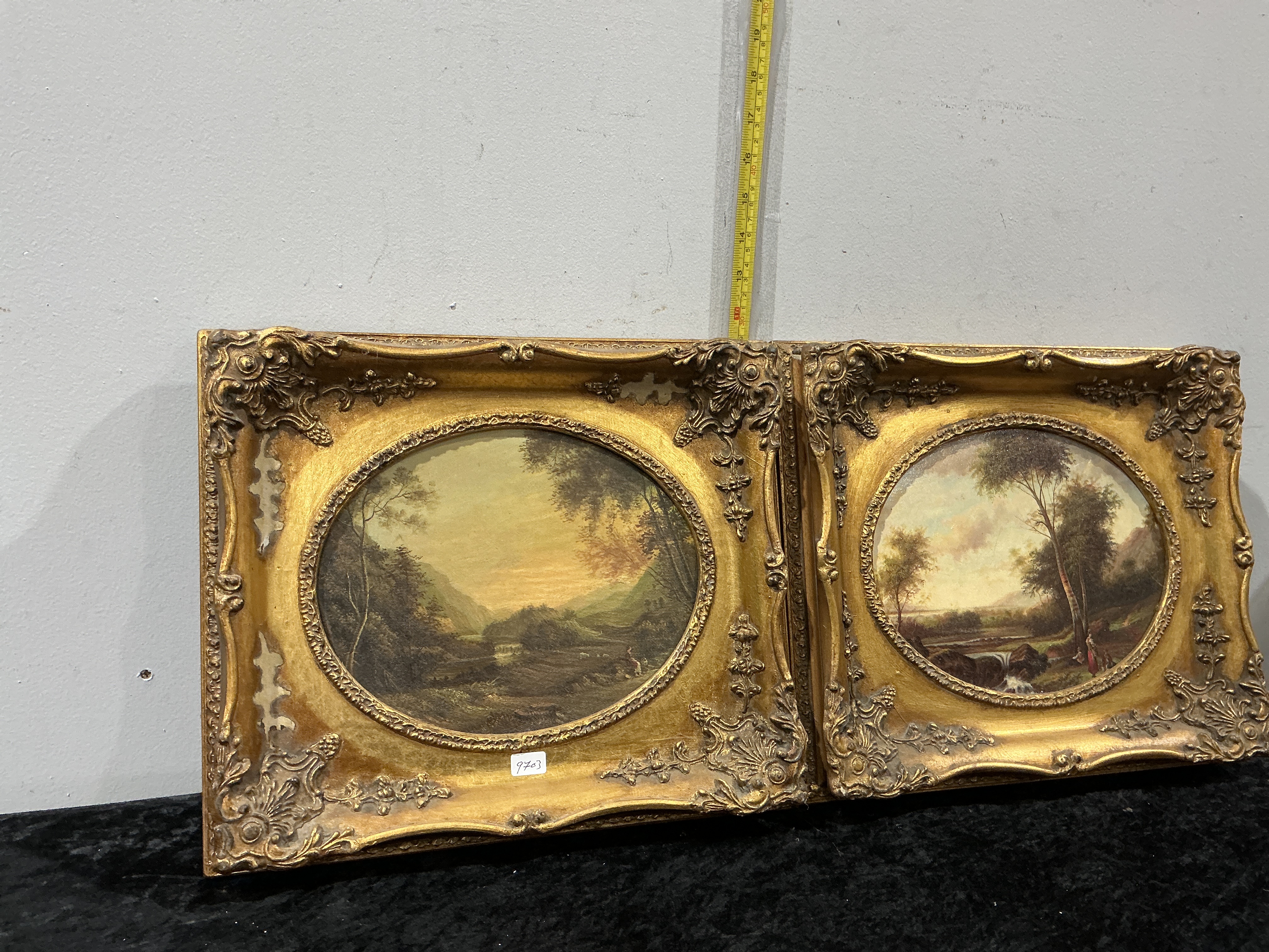 A pair of 19th-century style landscape oil paintings on board, attributed to the artist Van Thoren. One composition depicts a sweeping river valley under a warm sunset sky, while the other shows a wooded glen with a waterfall and figures. Both works are rendered in an atmospheric style with fine detail. The paintings are set within matching, elaborate gilt-composition frames featuring deep scrollwork, acanthus leaf motifs, and shell corners around oval apertures. The reverse of each frame is sealed with paper and carries a printed label for an English firm of Carvers and Gilders, Picture Makers and Restorers. A lot number sticker reading 9703 is present on one frame.