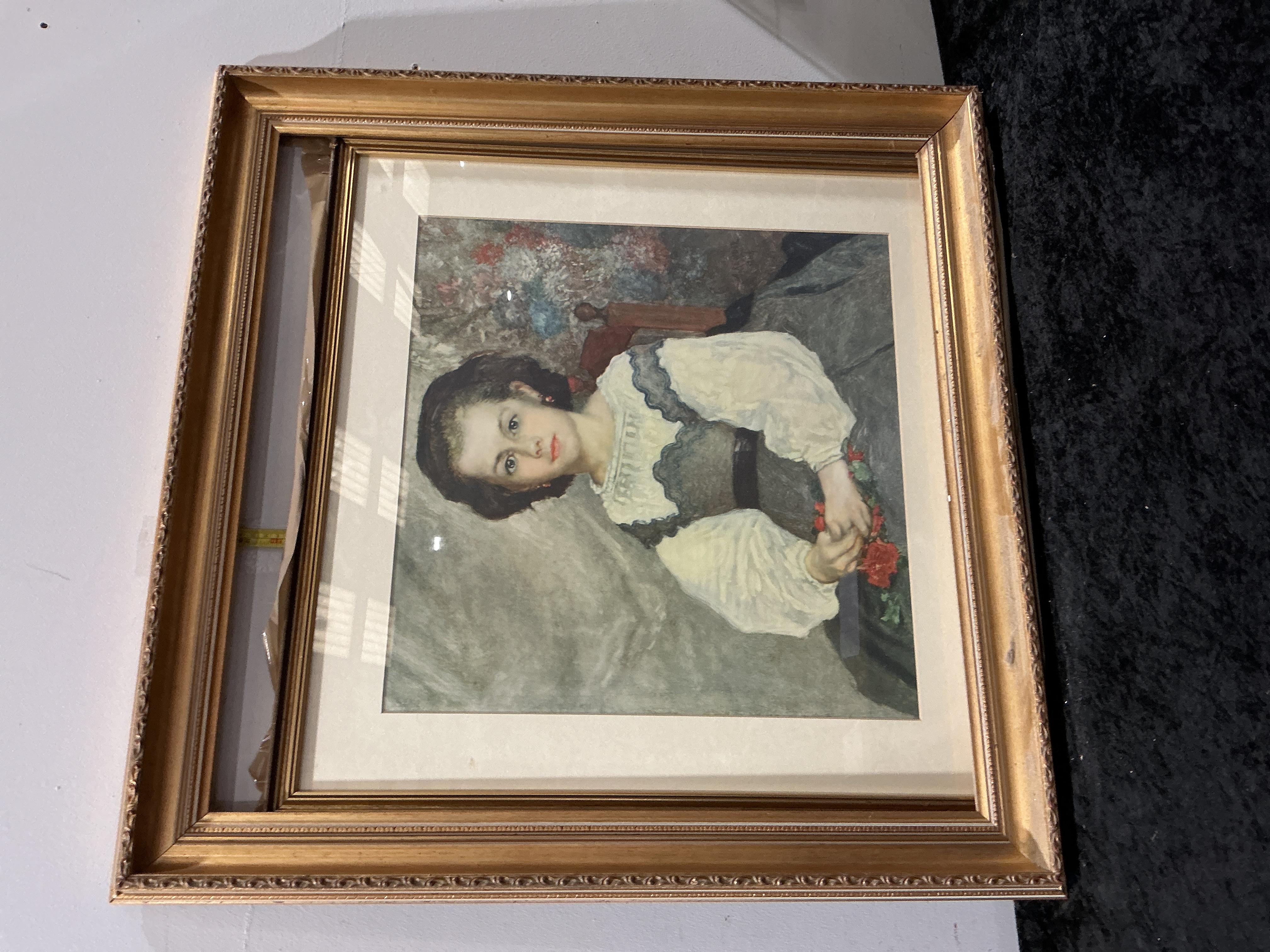 A colour print after the 1864 oil painting titled Mademoiselle Romaine Lacaux by Pierre-Auguste Renoir. The portrait depicts a young girl with dark hair wearing a white puffed-sleeve blouse and a dark, lace-trimmed bodice, holding a small bouquet of red flowers. The background is rendered with impressionistic floral motifs. The artwork is mounted under glass with a wide cream-coloured mat and presented in an ornate gilded frame with a beaded inner border and scrolled decorative mouldings. Based on the scale of the visible measuring tape, the dimensions are as follows: