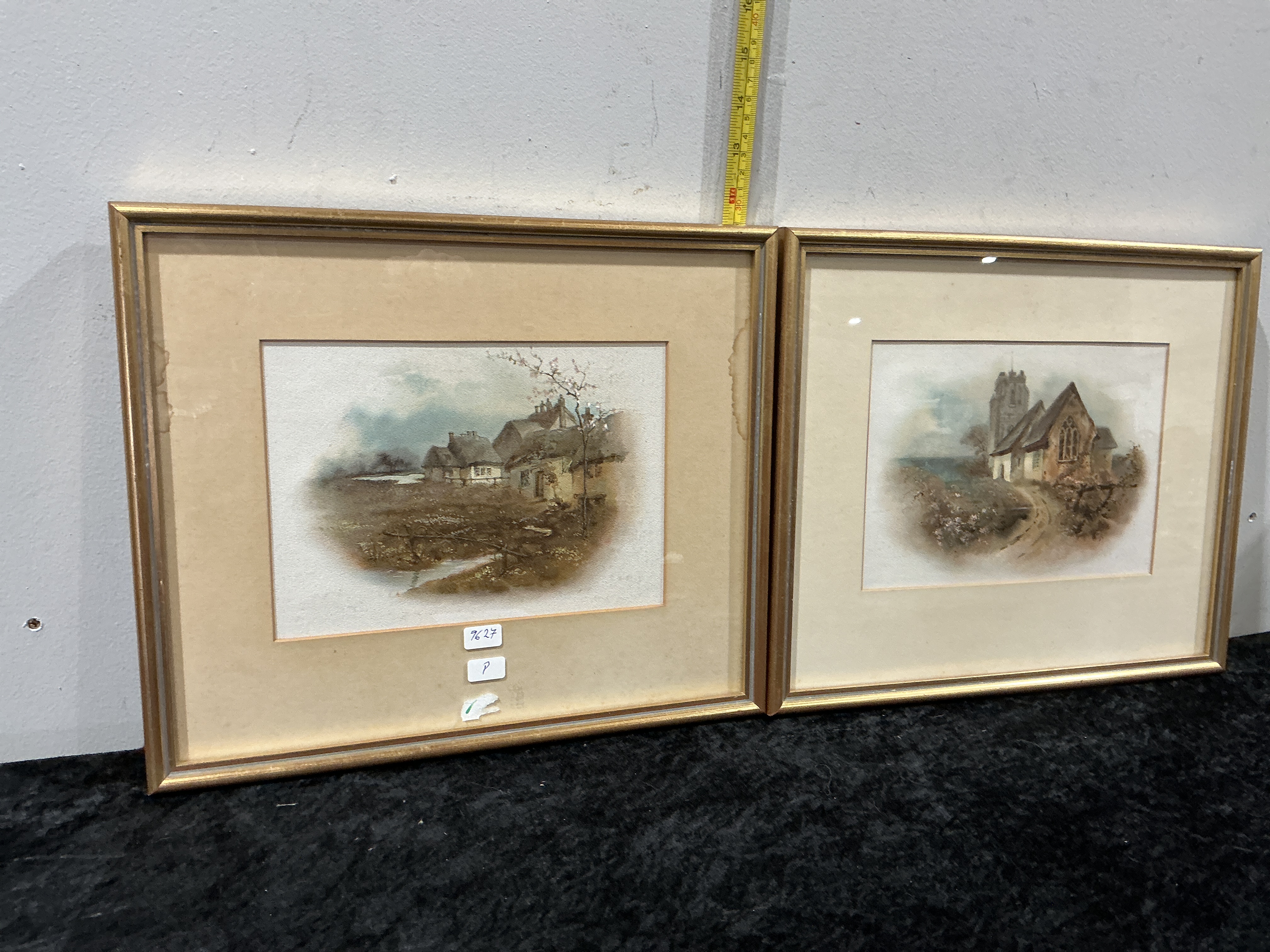 A pair of watercolour paintings on paper depicting traditional English rural scenes. One work features a cluster of thatched-roof cottages or farm buildings set within a landscape, while the other illustrates a stone parish church with a square tower situated on a rising path. Both are executed in a soft, atmospheric style characteristic of the period. The works are presented in matching gilt-finished frames with cream-coloured mounts. No signatures or inscriptions are visible on the front of either work.