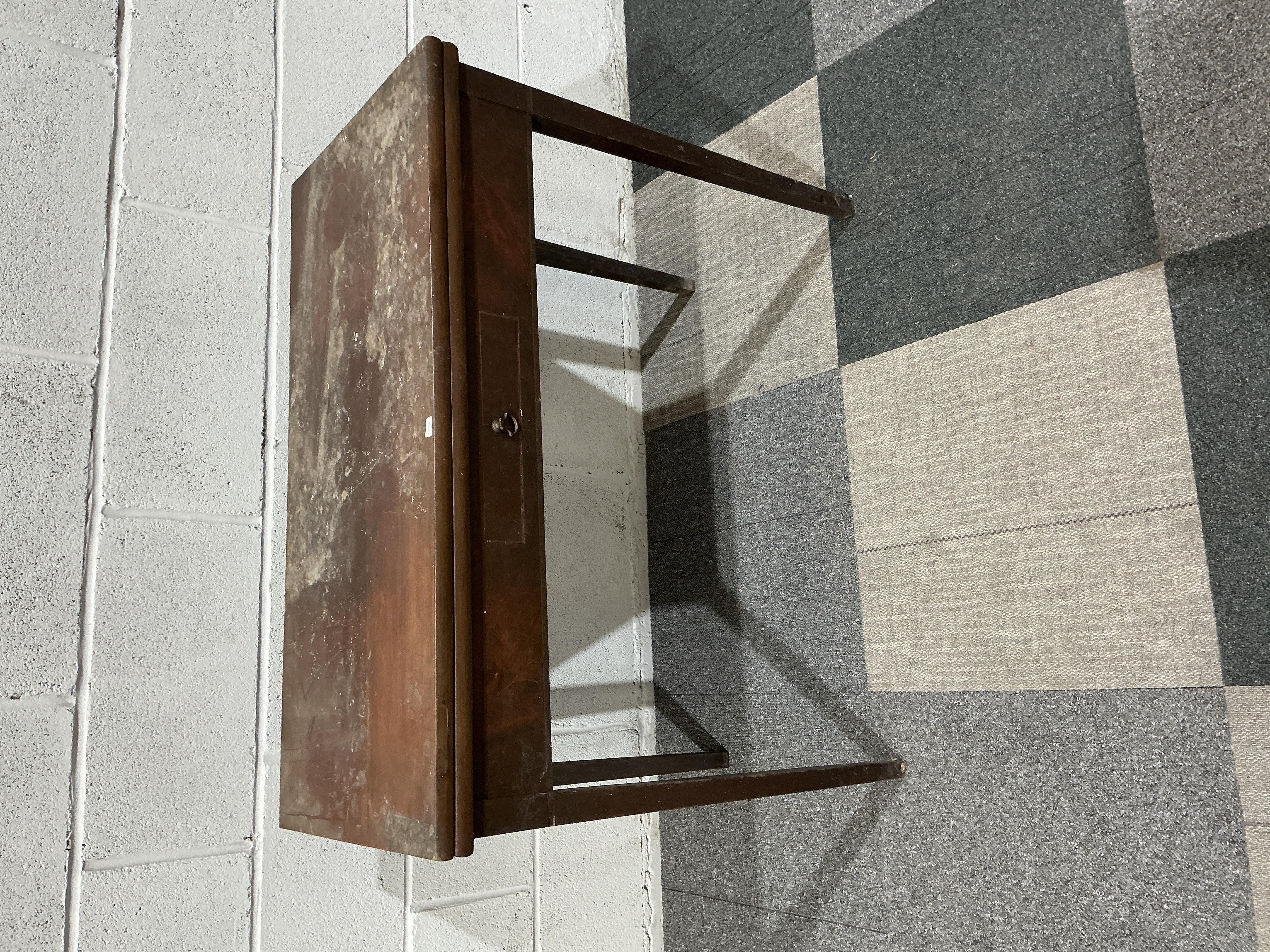 A nineteenth-century mahogany side table of English origin. The piece is constructed with a solid mahogany rectangular top featuring a single drop-leaf to one side. The deep frieze contains a single drawer fitted with a turned wooden knob handle. The table is supported by four square tapered legs, a design characteristic of late Georgian or early Victorian utility furniture. No maker’s marks or labels are present on the exterior surfaces.