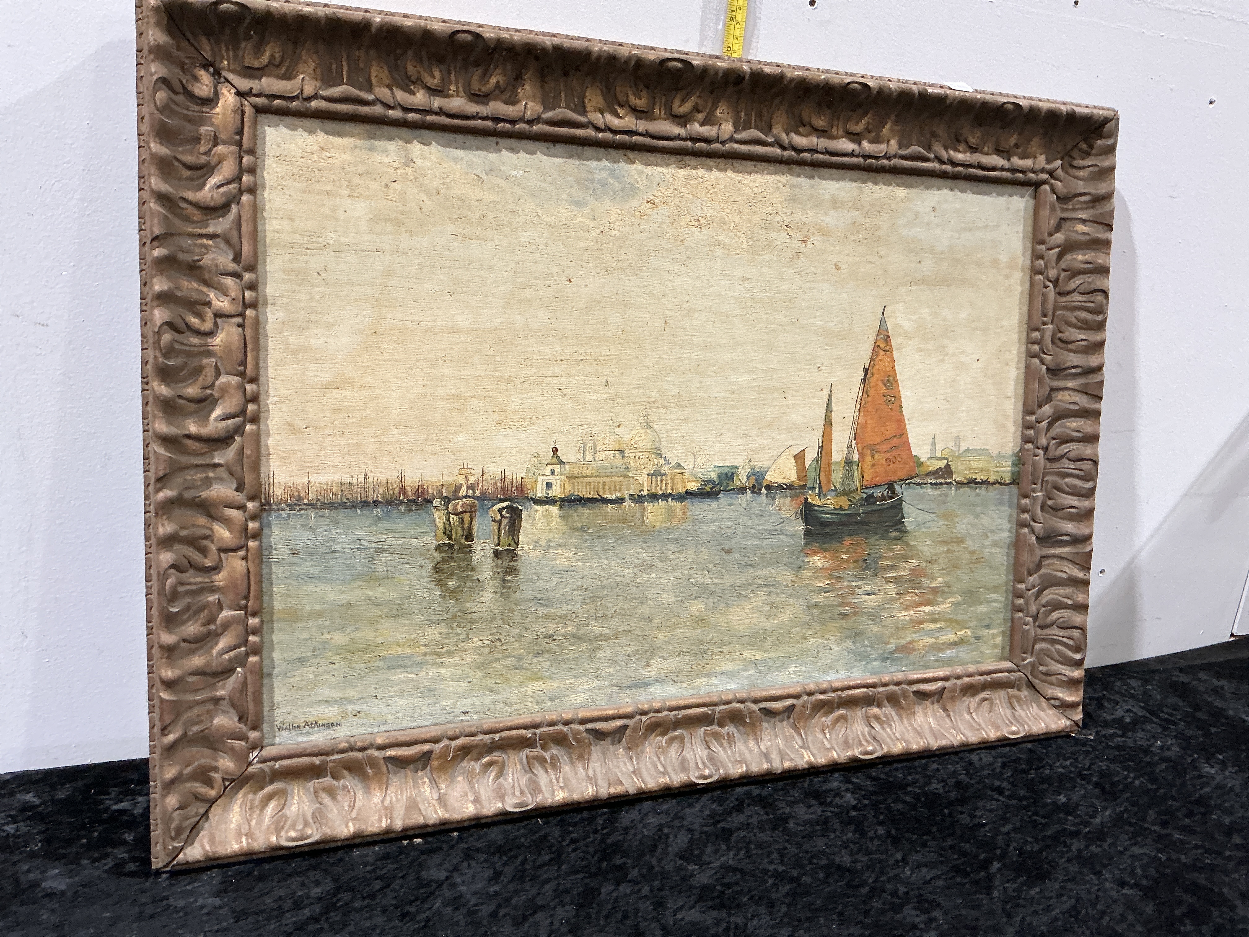This oil on panel painting by Walter Atkinson depicts a maritime scene of the Venetian lagoon. The composition features several sailing vessels, including a prominent boat with traditional ochre and orange sails in the mid-ground. In the distance, the silhouette of the Basilica di Santa Maria della Salute and other architectural landmarks are visible through an atmospheric haze. The work is executed in an impressionistic style with visible, textured brushwork and impasto highlights that capture the reflections on the water’s surface. The painting is signed Walter Atkinson, in the lower-left corner. It is housed in a substantial and ornate gilded composition frame decorated with deep-relief scrolling foliate and acanthus leaf patterns.