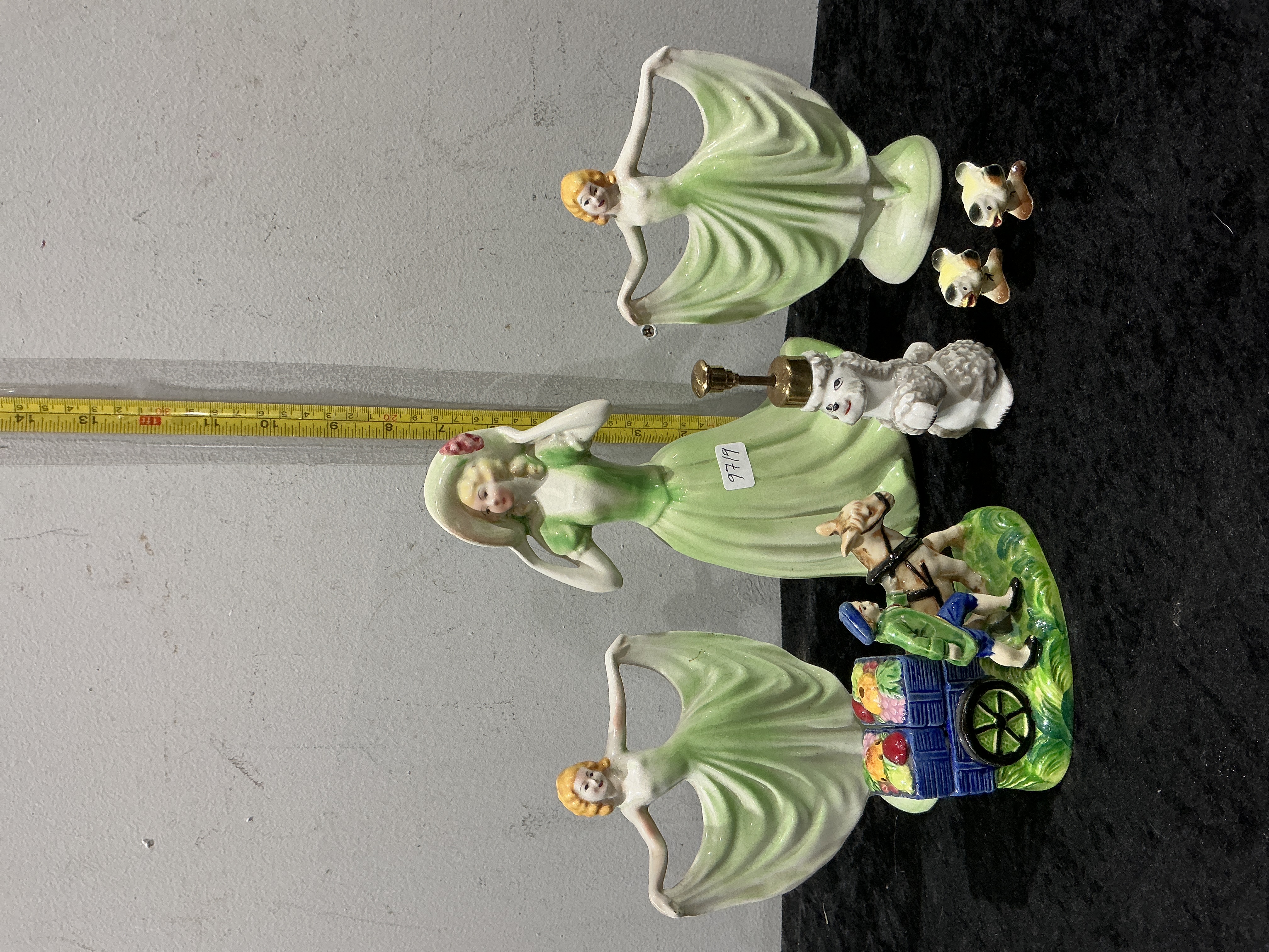 This collection consists of multiple vintage decorative ceramic figurines. The group includes figures of ladies in pale green flowing gowns, featuring some in dancing poses and another wearing a wide-brimmed floral hat; these figures are designed in the style of Josef Originals. The lot also contains a white poodle figurine equipped with a gold-toned metal perfume atomiser pump mechanism. Other pieces include a polychrome group of a donkey-drawn cart laden with fruit and vegetables being led by a figure in a green coat, and small animal figurines with black and yellow glazed details. One item bears an adhesive label marked 9719.