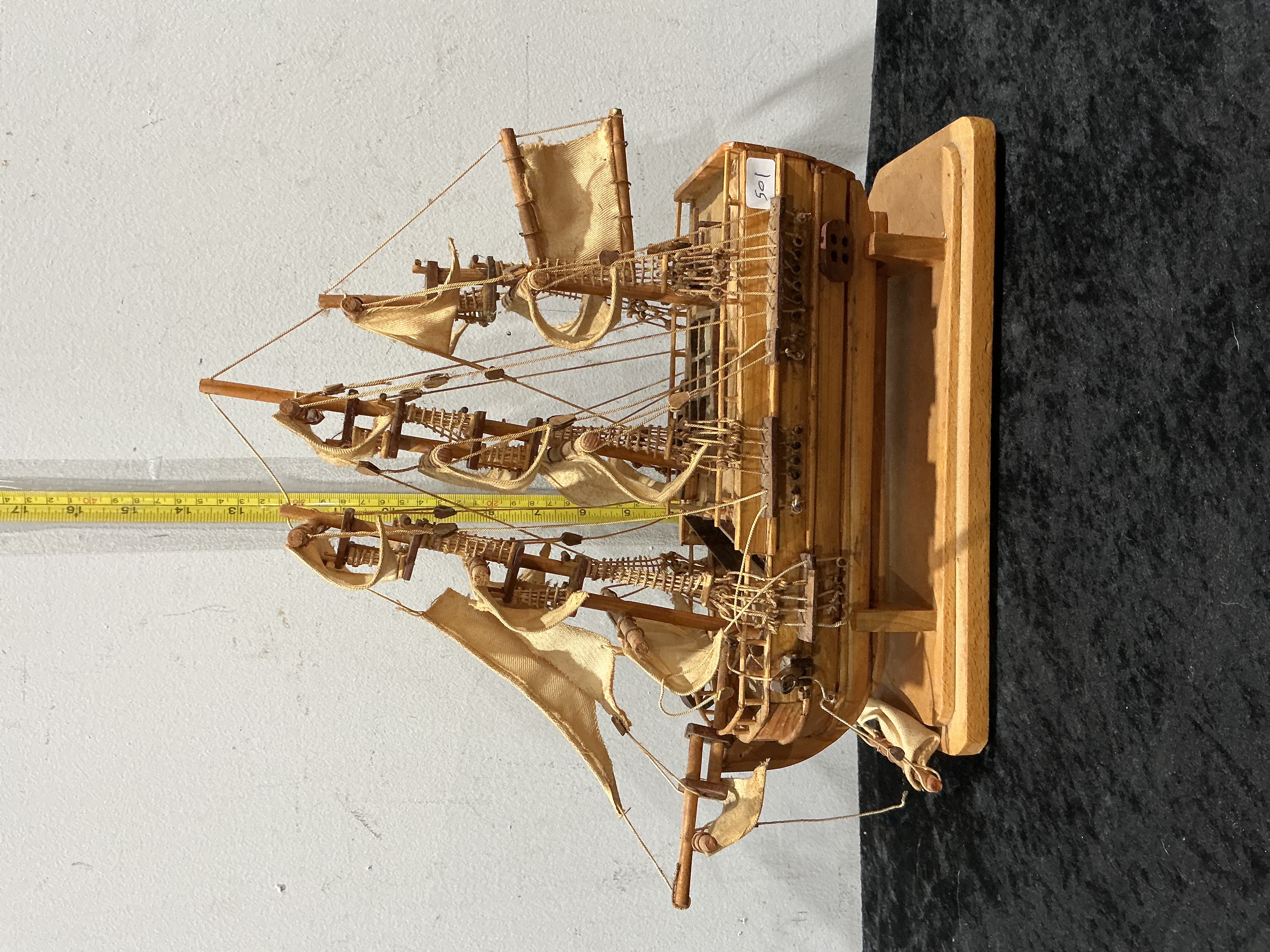 A traditional Chinese junk ship wooden model. The vessel features a three-masted design with a wooden hull and is mounted on a rectangular wooden display stand. The sails are constructed from a light-coloured fabric and are rigged with fine string. The model displays decorative wooden deck features and includes a small white label with the handwritten digits 501 affixed to the deck area. The construction employs natural wood finishes throughout.