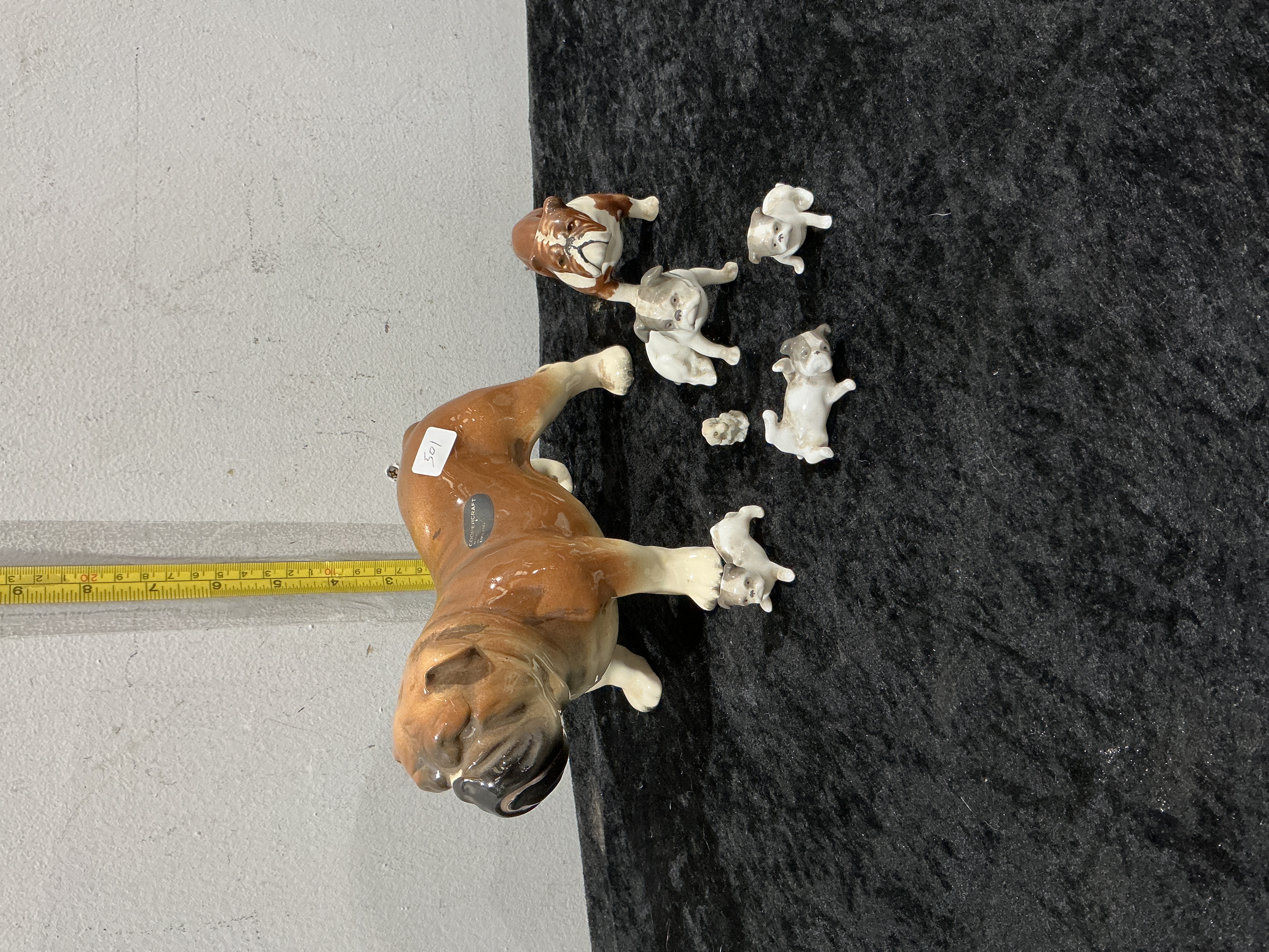 This collection of glazed ceramic figurines features a large standing English Bulldog and several smaller puppies in various poses. The larger figure is decorated with a mottled brown and white glaze and carries an original oval paper label for Coopercraft, Made in England. The accompanying group includes figures in sitting, walking, standing, and reclining positions, finished in varied brown, white, and grey glazes. One small puppy is positioned standing at the front leg of the large bulldog. A rectangular inventory sticker with the number 501 is attached to the back of the larger figure.