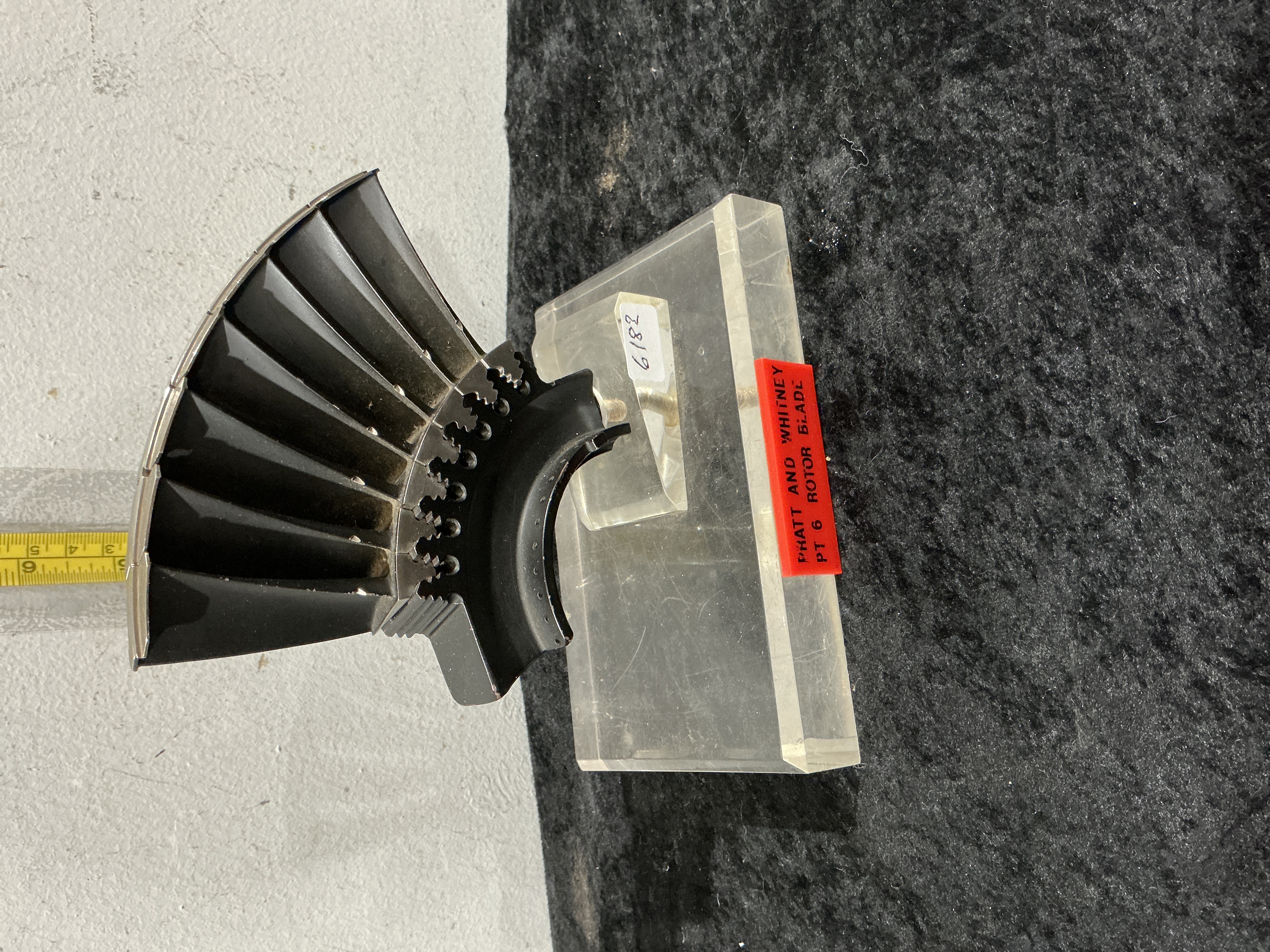 An aviation memorabilia display piece featuring a segment of a turbine rotor blade assembly from a Pratt & Whitney PT6 engine. The metal component consists of several dark-coated blades joined by a curved, interlocking fir-tree root. The assembly is mounted onto a clear acrylic block base. Affixed to the front of the base is an embossed red plastic label that reads PRATT AND WHITNEY PT6 ROTOR BLADE. A smaller white paper label is also adhered to the acrylic, containing the handwritten numbers 6182. The metal retains a dark industrial finish consistent with its history as a decommissioned engine part.