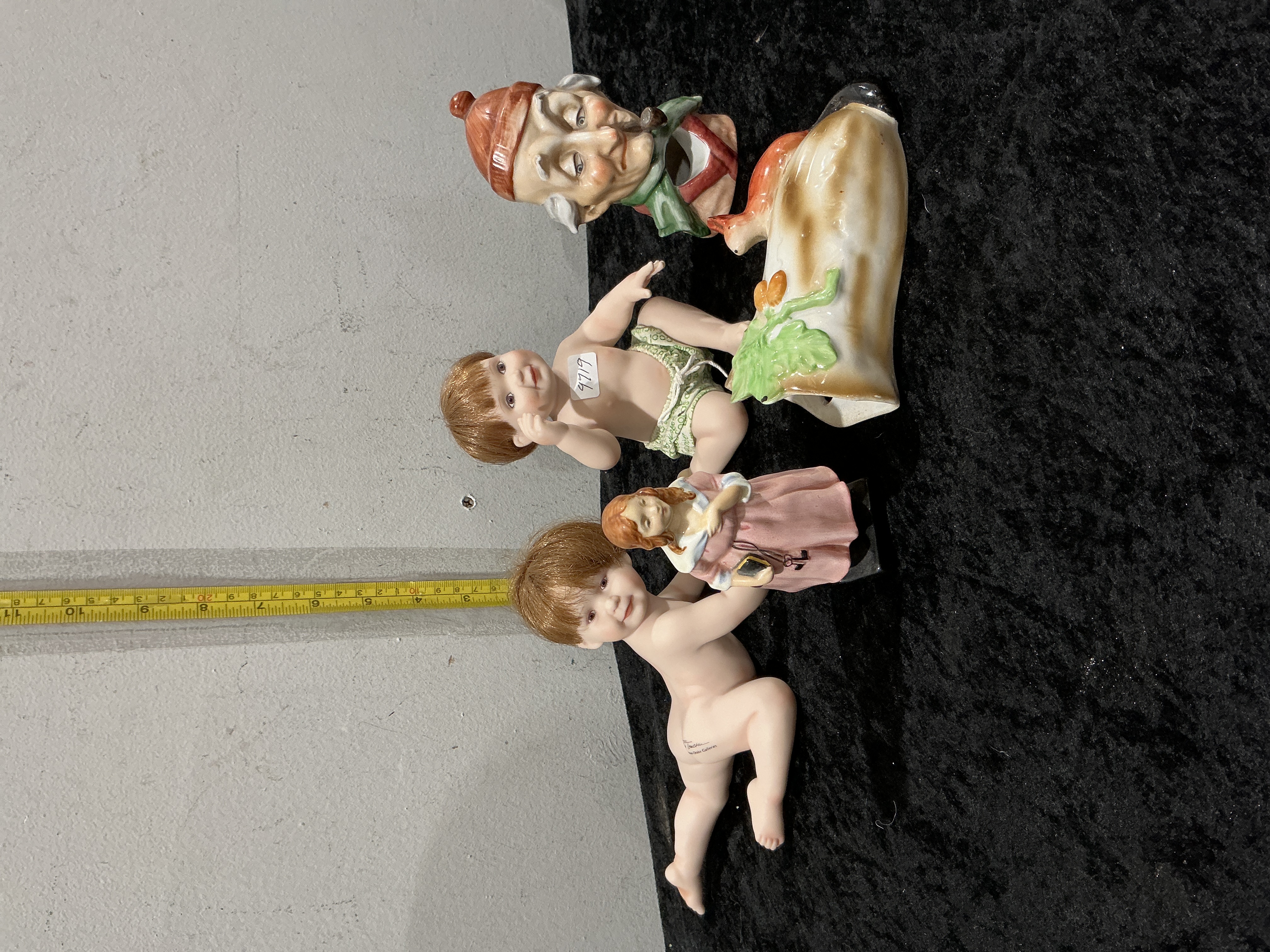 An assortment of decorative ceramic and bisque porcelain items. The collection includes two bisque porcelain piano babies, one of which bears a printed mark for Flambro and The Diana Collection on the thigh. This figure is shown in a reclining pose with moulded hair. The second bisque baby is seated and wears green patterned briefs. The lot also features a glazed ceramic wall pocket shaped as a character head of an elderly man wearing a red hat and smoking a pipe, a rustic tree trunk style glazed ceramic planter with bird and leaf motifs, and a small figurine of a girl in a pink dress and white apron holding a cat.