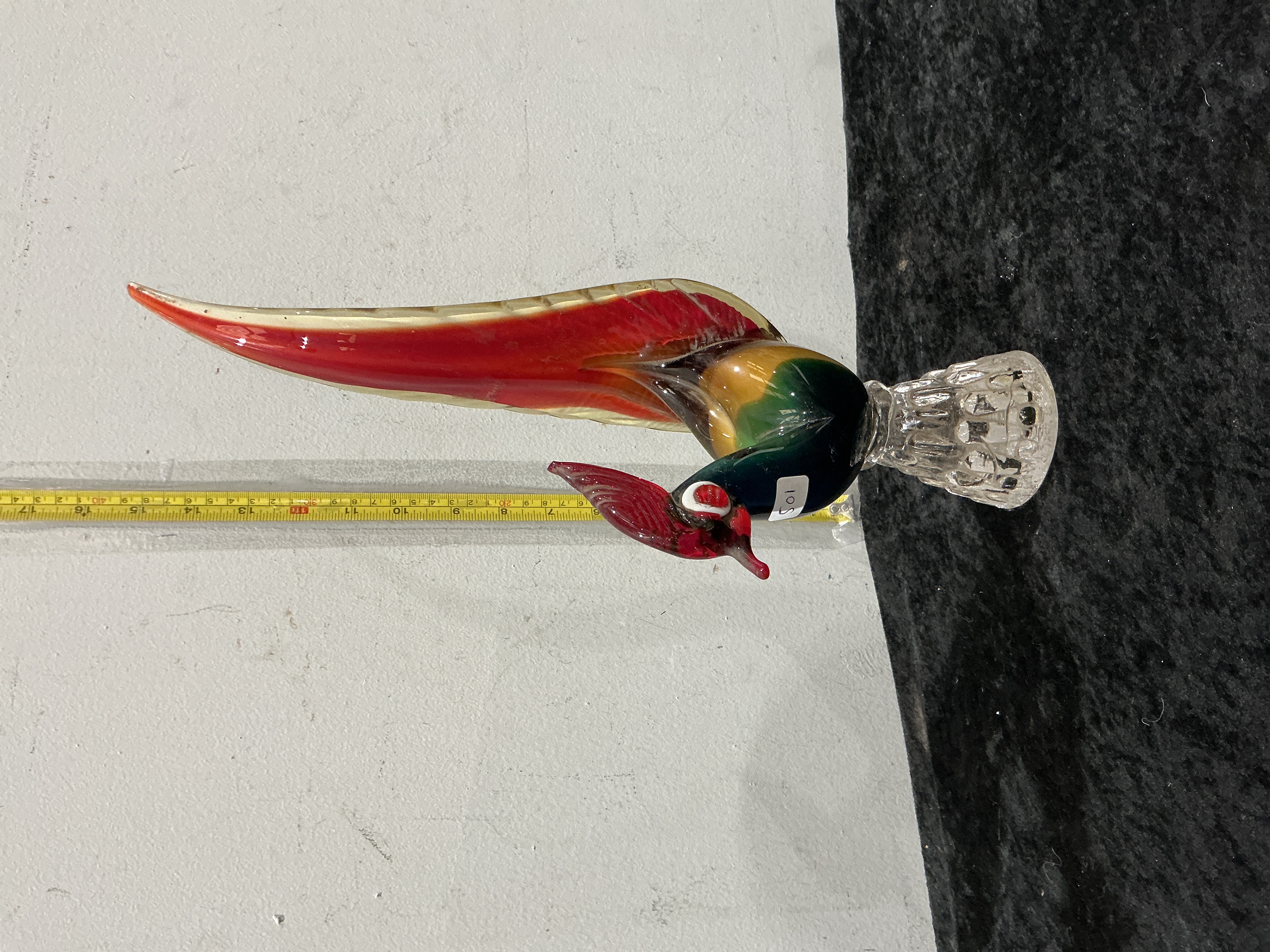 A large hand-blown art glass figurine of a parrot, produced in the Murano tradition. The sculpture is crafted with vibrant layers of colour, featuring a long, tapering tail in red and amber tones, a body transitioning from golden-yellow to deep green, and a red head with a crest and white eye detailing. The bird is mounted upon a clear, textured, and multi-faceted glass base. No permanent maker marks or signatures are visible to the glass. A small white inventory label with the handwritten numerals 105 is attached to the neck area.