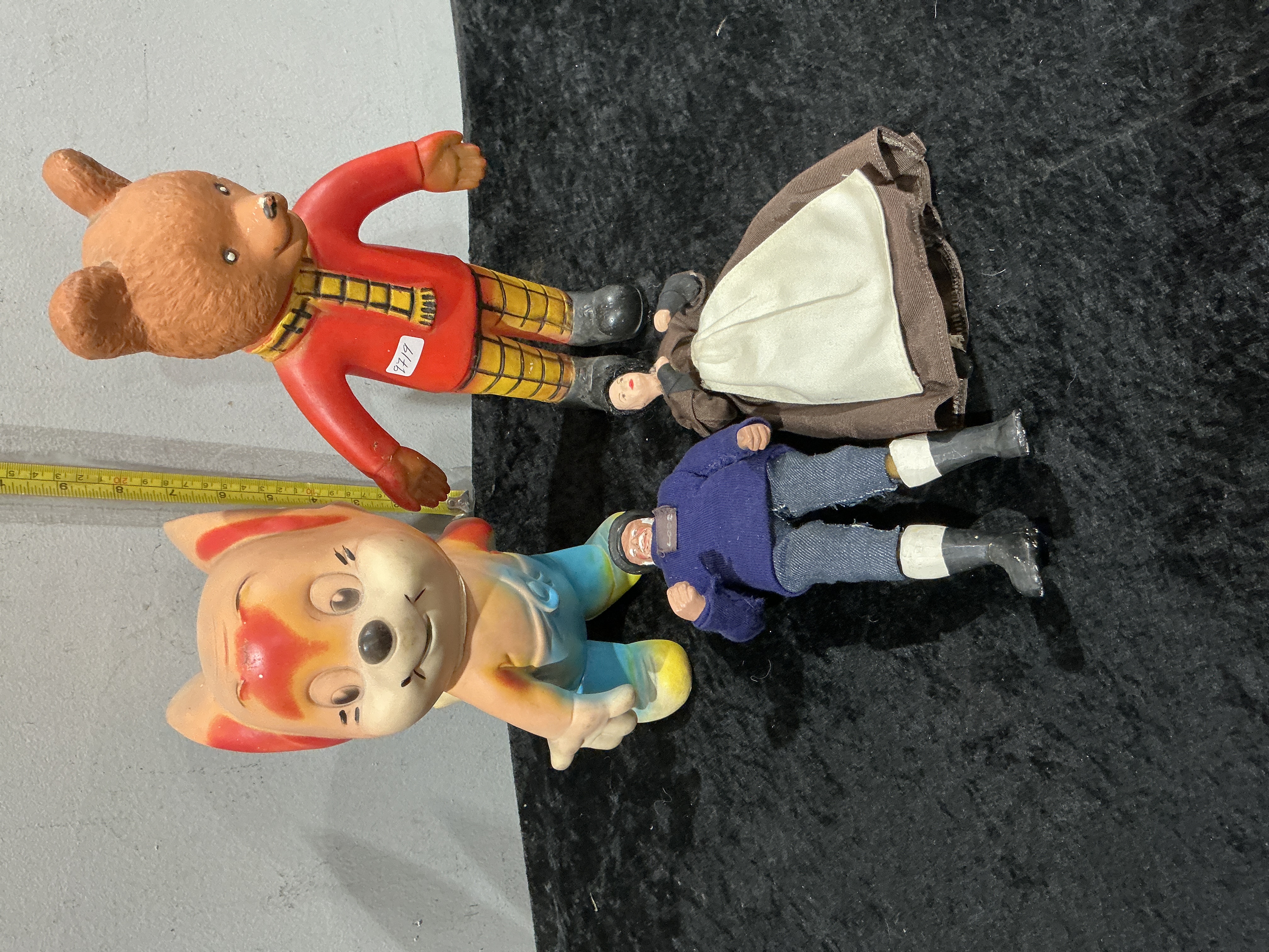 An assortment of vintage toy figures, featuring a moulded rubber or vinyl figure of the character Rupert the Bear. Rupert is depicted in his signature attire, consisting of a red jumper with a yellow and black checked scarf and matching trousers. A small adhesive label bearing the number 9719 is present on the jumper. The collection also includes a large moulded rubber or vinyl figure of a stylized cartoon animal, featuring large eyes and vibrant red and blue markings, with embossed marks to the chest area. Completing the group are two posable dolls with hand-painted moulded heads and fabric clothing; one represents a female character in a brown gown and white apron, while the other is a male maritime-style character wearing a blue knit jumper, denim-style trousers, and black boots with white tops.