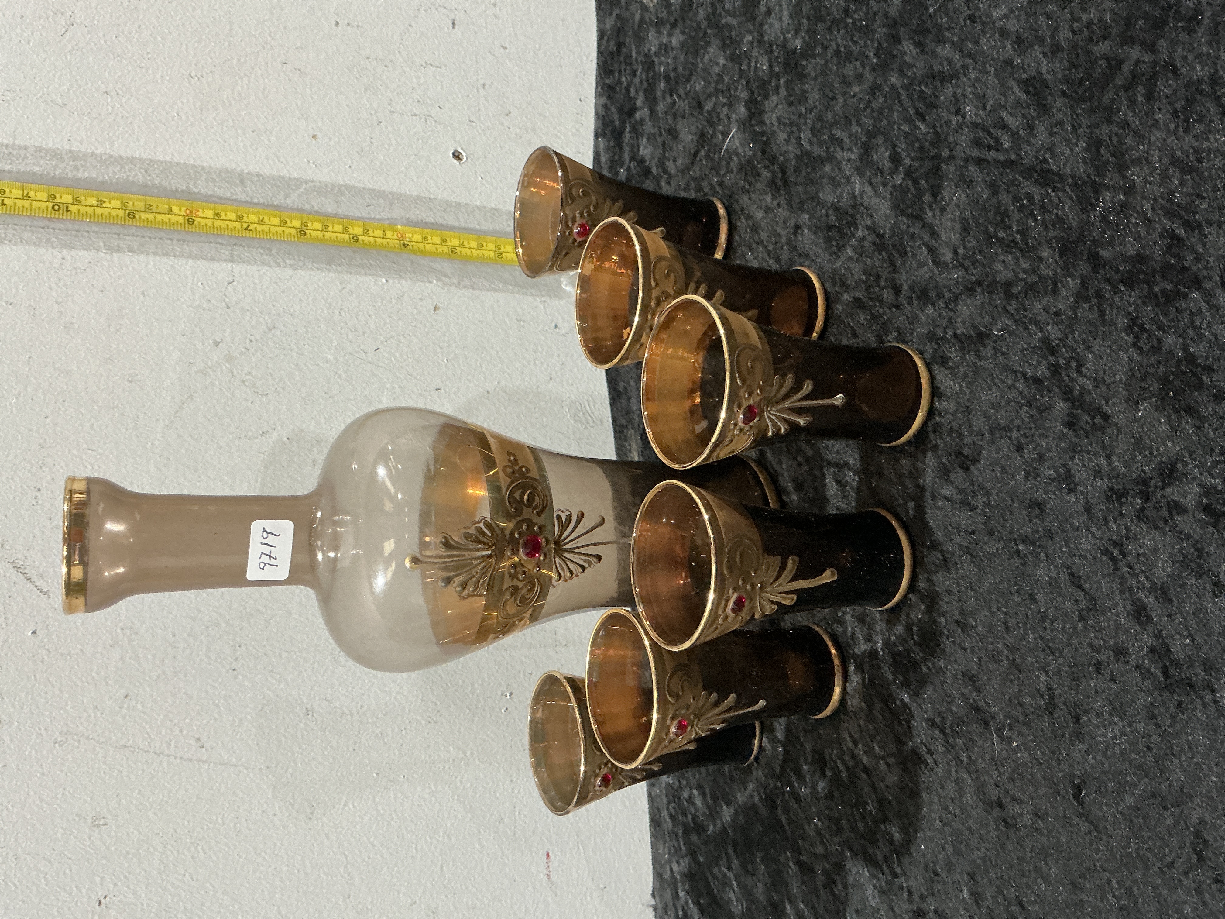 A set of mid-20th century Venetian amber art glass, comprising a decanter and several matching liqueur glasses. Each piece is constructed from amber-tinted blown glass, featuring elaborate raised gilt enamel decoration in scrolling foliate and filigree patterns. The design is further accented with applied red glass cabochons. The decanter has a tall, waisted form with a flared rim. No maker’s marks or signatures are present; a paper inventory label numbered 9719 is adhered to the neck of the decanter.