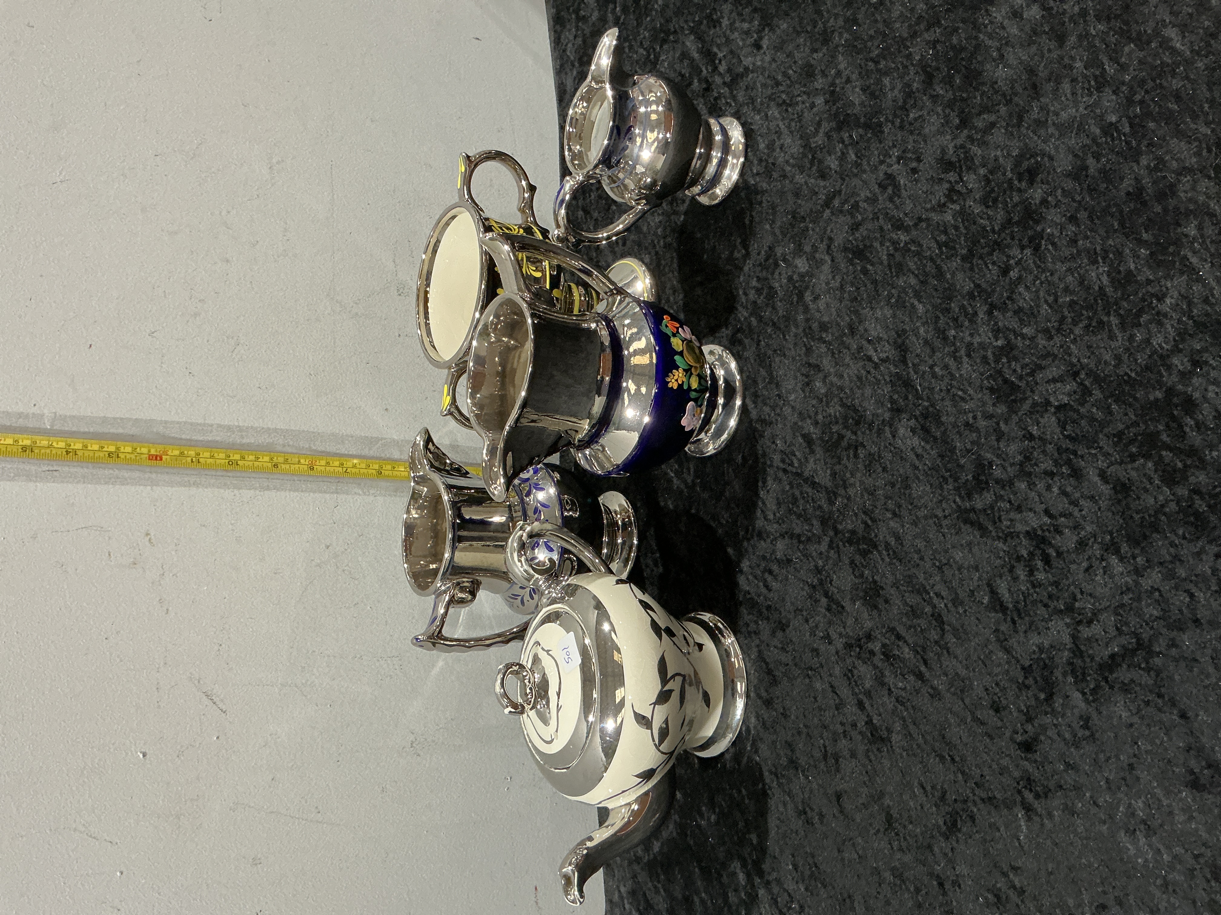 A collection of ceramic lustreware comprising a lidded teapot and several creamers and jugs. The items feature diverse decorative techniques including a cobalt blue jug with hand-painted polychrome floral motifs and silver lustre highlights, and a cream-coloured teapot with black transfer-printed foliage. Multiple pieces show Art Deco influences with stepped bases and geometric silver lustre banding. These metallic glazes are indicative of mid-20th century British manufacture, notably makers such as Sadler. A small white label marked 501 is present on the teapot lid. No factory marks are visible on the exterior surfaces.