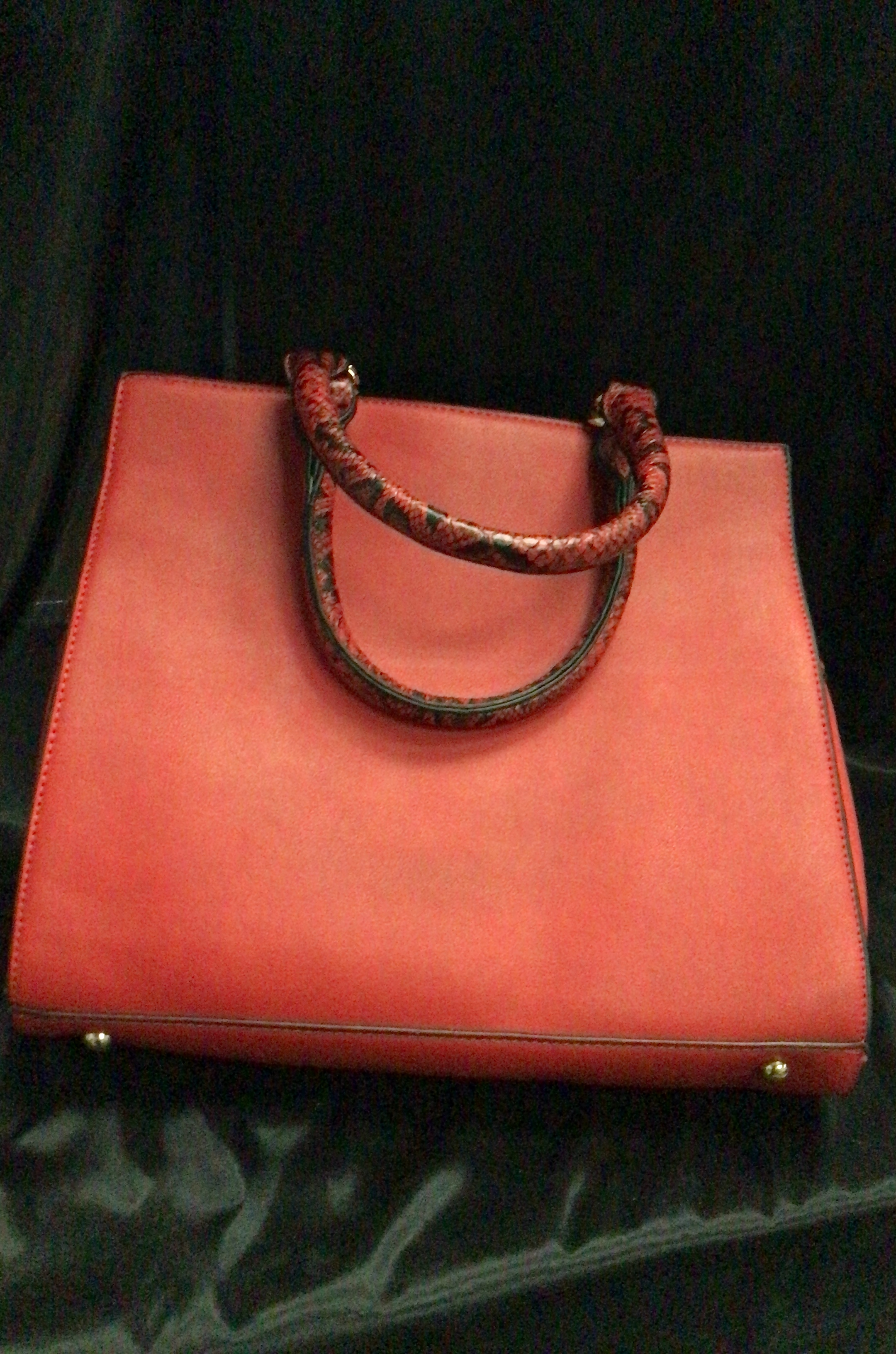 A red structured handbag with braided dark patterned handles and gold-toned hardware.