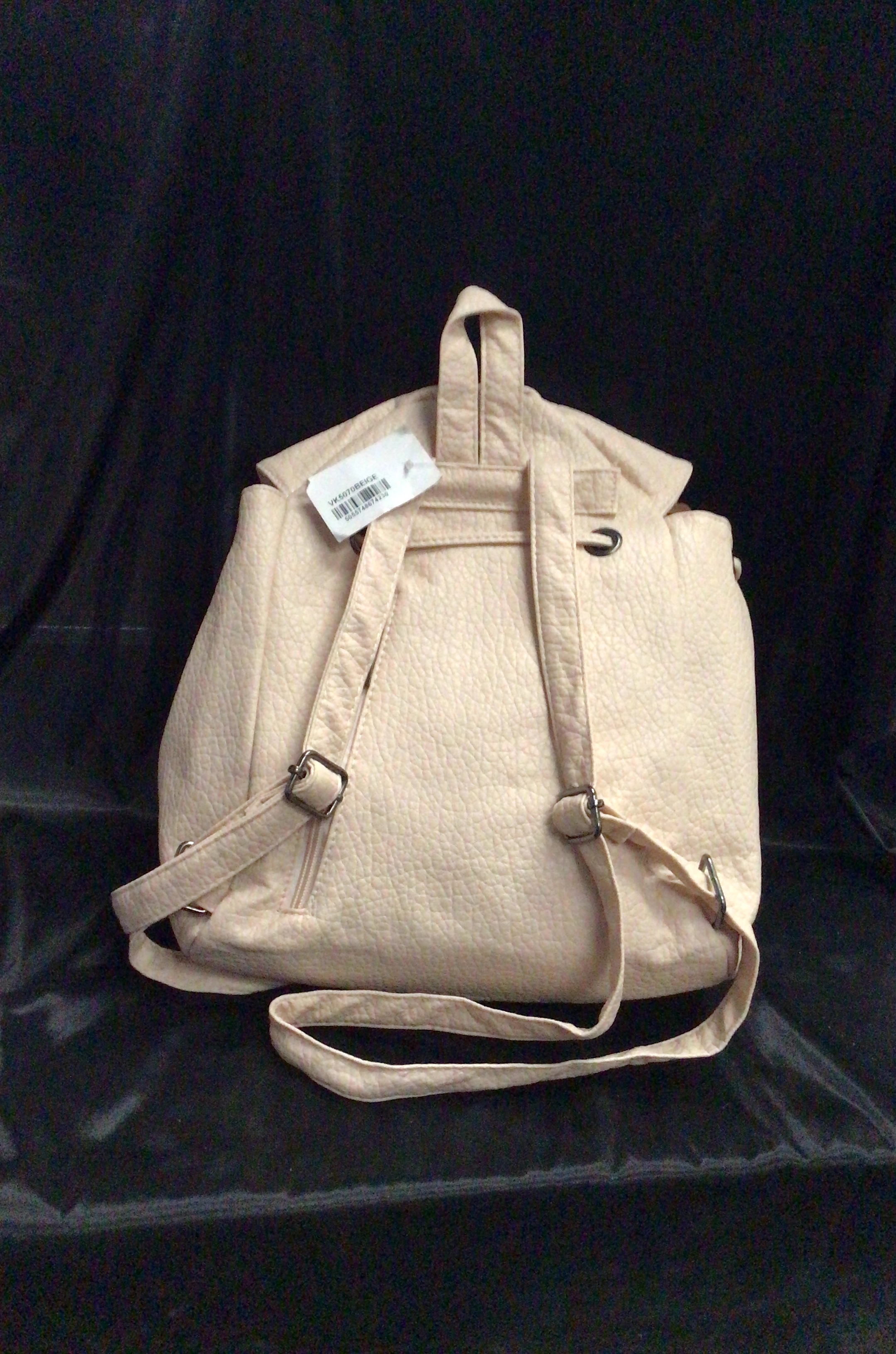A light beige faux leather backpack featuring a flap closure with a silver-tone metal clasp, drawstring, and a zippered back pocket.